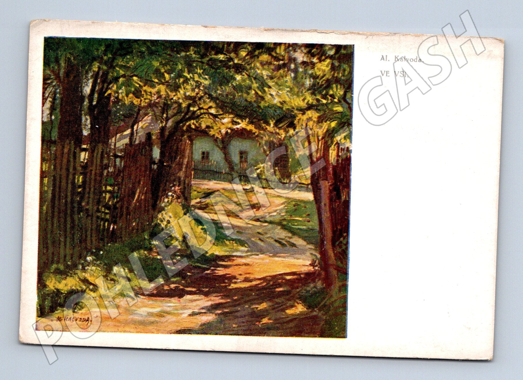 Pohlednice s motivem obrazu od slavného českého malíře Aloise Kalvody s názvem Ve vsi . Umělecká pohlednice zachycuje romantickou venkovskou krajinu s domkem mezi stromy a slunečný den. Na zadní straně je pohlednice neprošlá poštou, čistá, v dolní části je logo vydavatele Minerva Praha a číslo 694-4. Pohlednice je ve velmi dobrém stavu s drobnými stopami času na rozích. Vhodné pro sběratele uměleckých pohlednic či zájemce o české malířství.