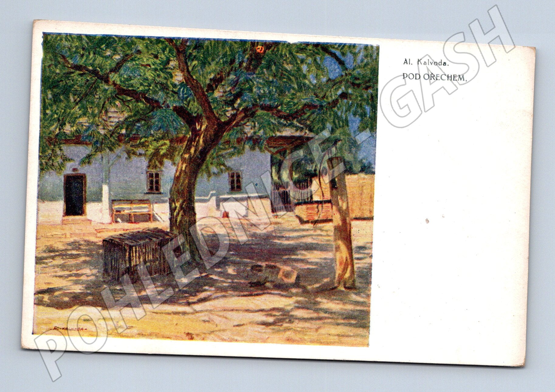 Originální pohlednice s reprodukcí obrazu od známého českého malíře Al. Kalvody s názvem Pod ořechem . Na přední straně je umělecké ztvárnění klidného venkovského dvora s majestátním ořešákem, lavičkou a domem v pozadí. Zadní strana pohlednice je nepopsaná a nese označení vydavatele Minerva Prague. Jedná se o sběratelsky atraktivní kousek vhodný do sbírky pohlednic s malířskou tematikou nebo do sbírky děl Al. Kalvody. Pohlednice je v pěkném stavu, drobné známky stáří pouze na okrajích.