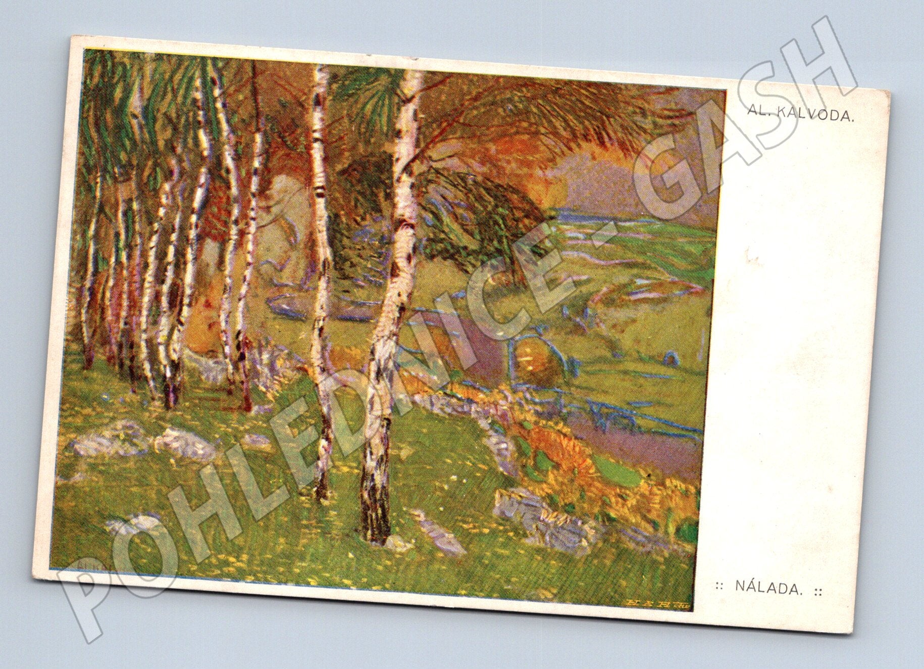 Starší pohlednice z edice České umění, vydavatel Minerva Praha-Vinohrady. Na přední straně je reprodukce malby Nálada od českého malíře Aloise Kalvody. Pohlednice nebyla použitá (neprošlá poštou), zadní strana je čistá, mírné známky stáří a manipulace, pěkný sběratelský stav. Rozměr klasického malého formátu. Vhodná do sbírky českého výtvarného umění a pohlednic s motivy krajinomalby z počátku 20. století.