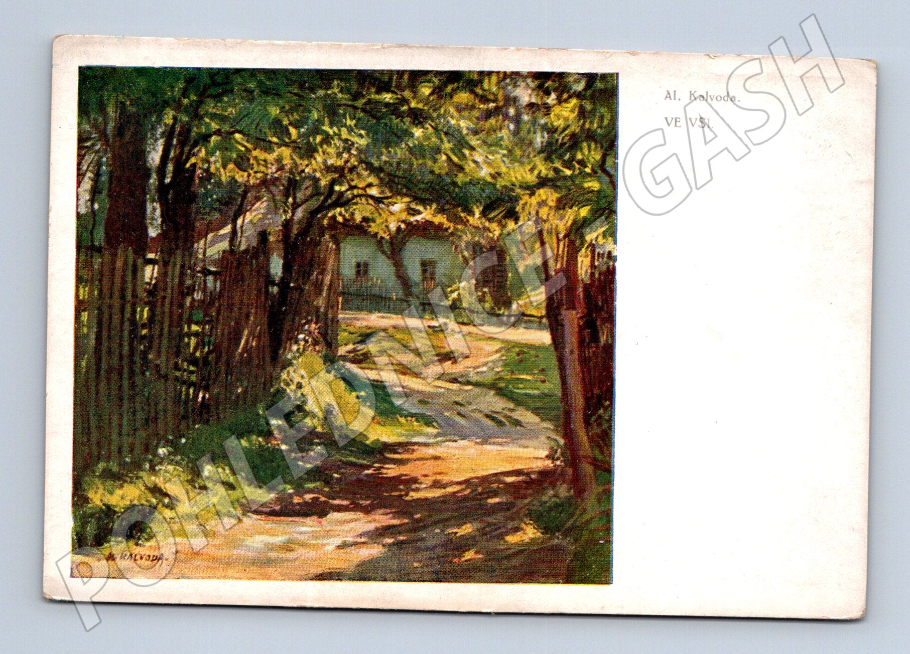 Starší pohlednice s uměleckým motivem od Al. Kalvody nazvaným Ve vsi . Na pohlednici je znázorněna malebná vesnická cesta vedoucí stínem aleje stromů směrem ke stavení, obraz je proveden ve stylu klasického českého krajinářství. Vlevo dole signatura autora, vzadu čistá, připravena k odeslání. Vydavatel Minerva Praha, č. 6944. Pohlednice vykazuje drobné stopy stáří a manipulace na okrajích, celkově dobrý stav.