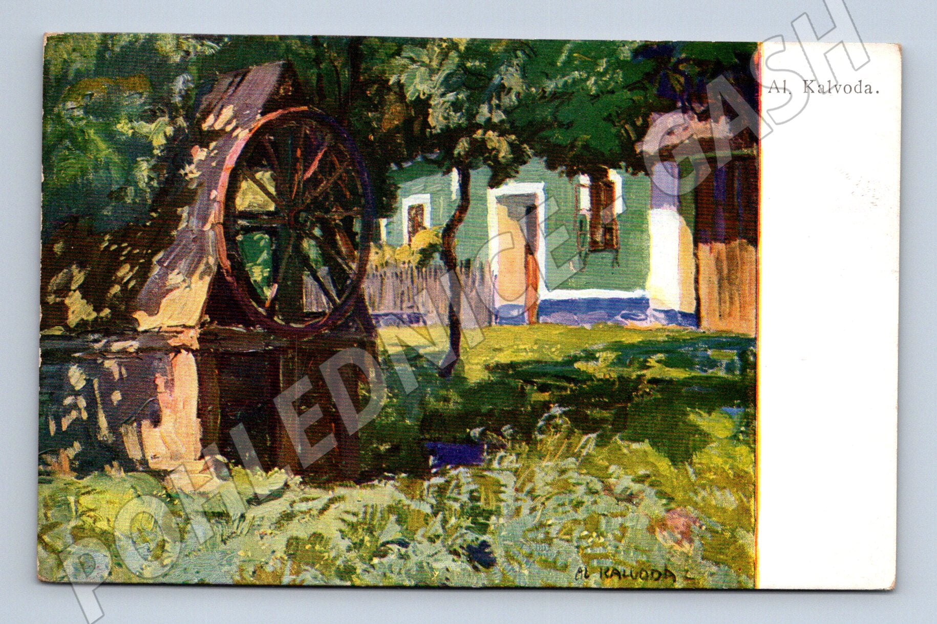 Tato pohlednice zobrazuje malovaný motiv venkovské studny a zeleného dvora před domem, autorem obrazu je slavný český malíř Alois Kalvoda. V levé části je signatura Al. Kalvoda a v pravé horní části pohlednice je jméno autora uvedeno. Pohlednice je neprošlá poštou, rubová strana je čistá, určena k volnému použití. Jedná se o sběratelský kus vhodný pro milovníky českého umění a malířů začátku 20. století. Celkový stav je velmi dobrý, bez výraznějších poškození.