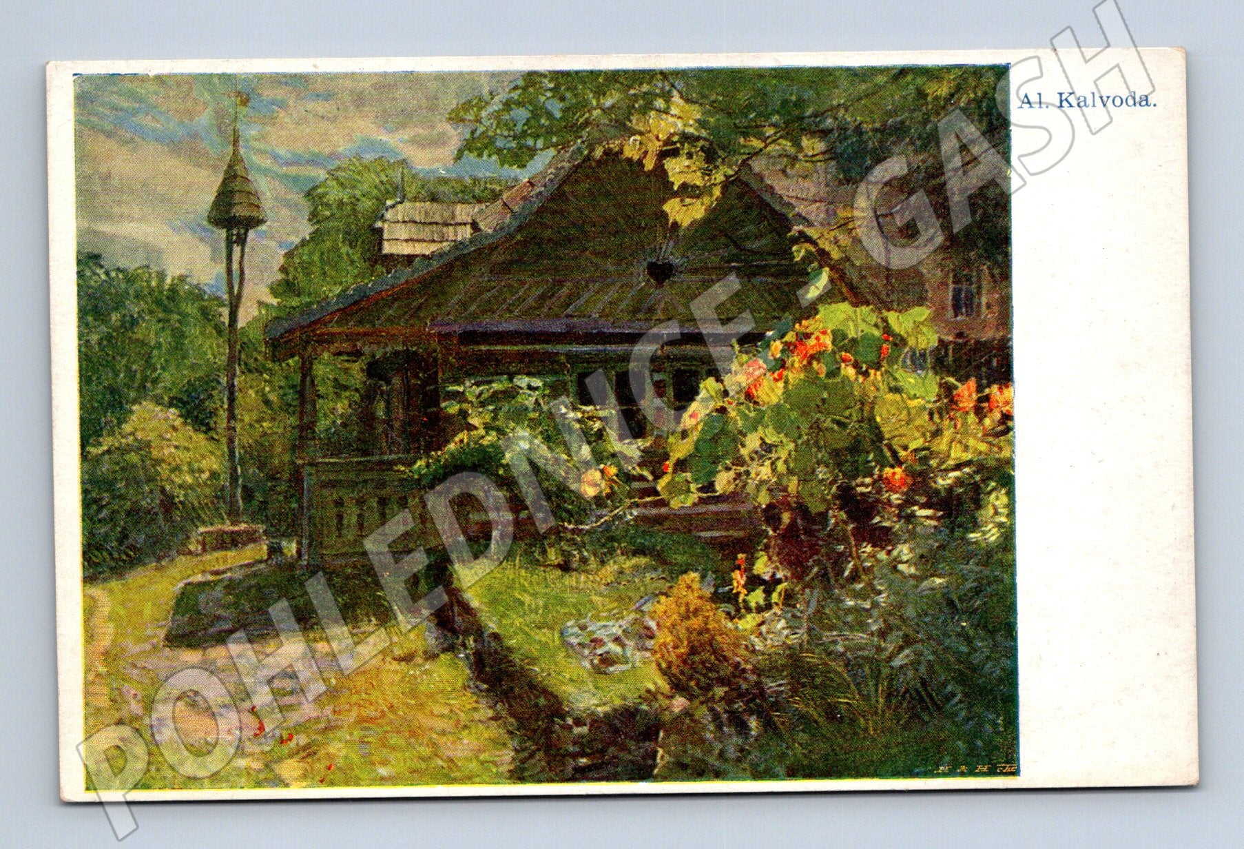 Nabízím originální pohlednici s reprodukcí obrazu známého českého malíře Aloise Kalvody. Pohlednice zachycuje malebnou venkovskou chalupu v letní krajině, obklopenou bohatou zelení a květinami. Krásný detail dřevěné stavby a teplé, slunečné barvy navozují příjemnou atmosféru českého venkova. Zadní strana pohlednice je nepopsaná, vhodná k dalšímu použití nebo pro sběratelské účely. Výborný stav, bez poškození. Ideální doplněk do sbírky pohlednic s malířskými motivy.
