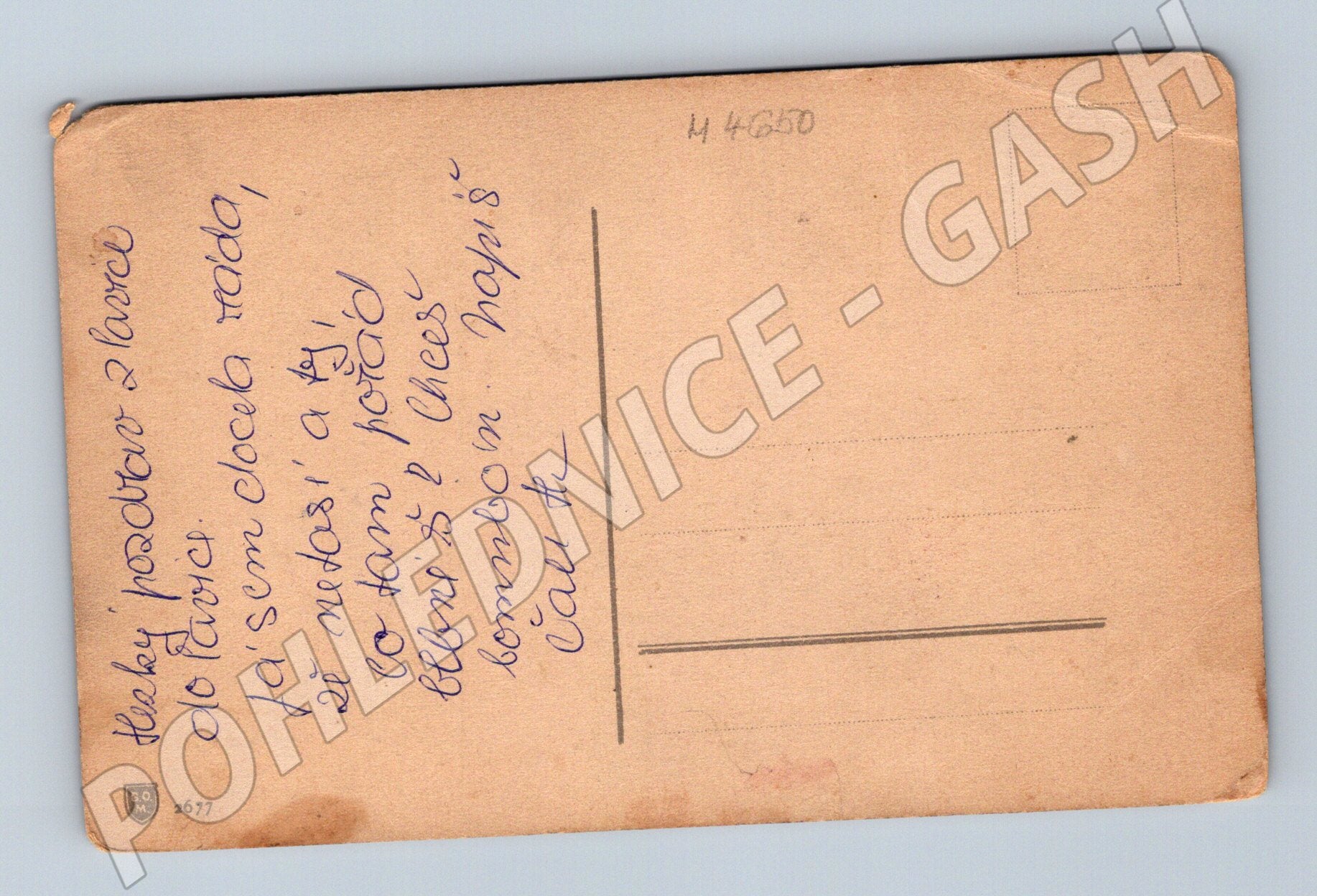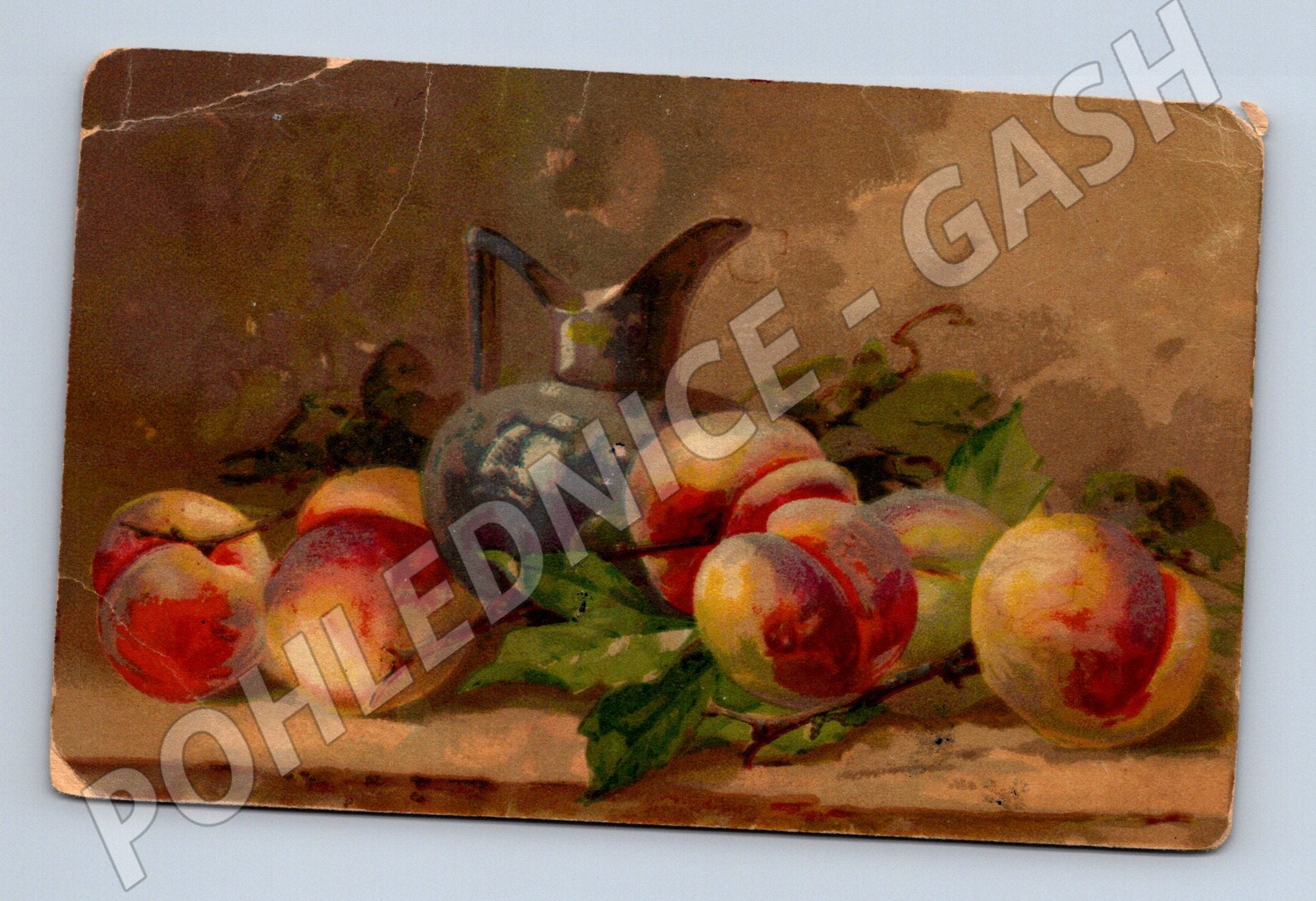Starší pohlednice s malířským motivem zátiší – na přední straně je vyobrazena umělecky zpracovaná váza s ovocem (broskve, listy). Pohlednice je opotřebená, s ohnutými rohy a známkami stáří. Na zadní straně je ručně psaný vzkaz a není zde nalepená poštovní známka. Grafika a styl odpovídají klasickému malířství, pohlednice zaujme zejména sběratele umělecky zpracovaných zátiší.