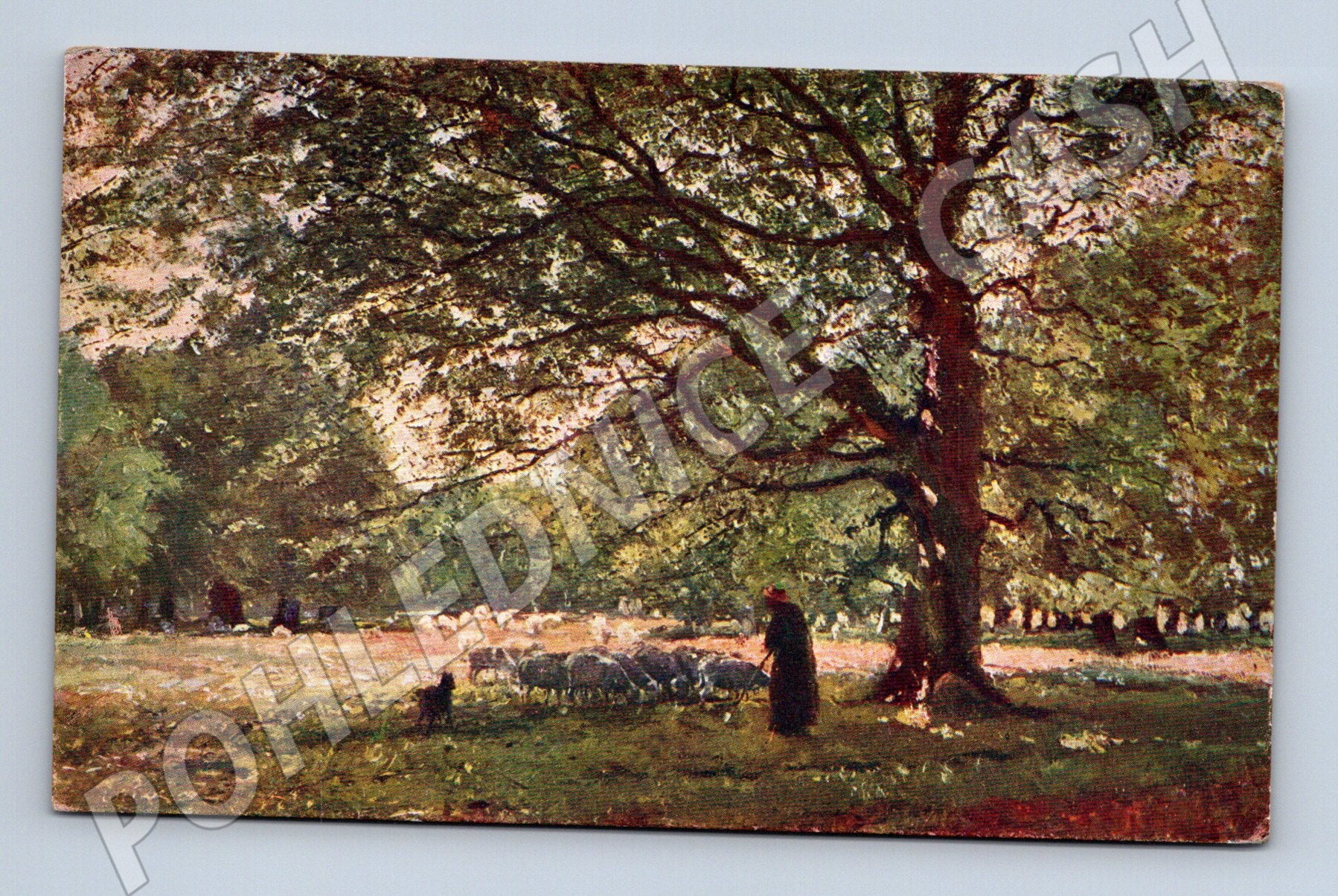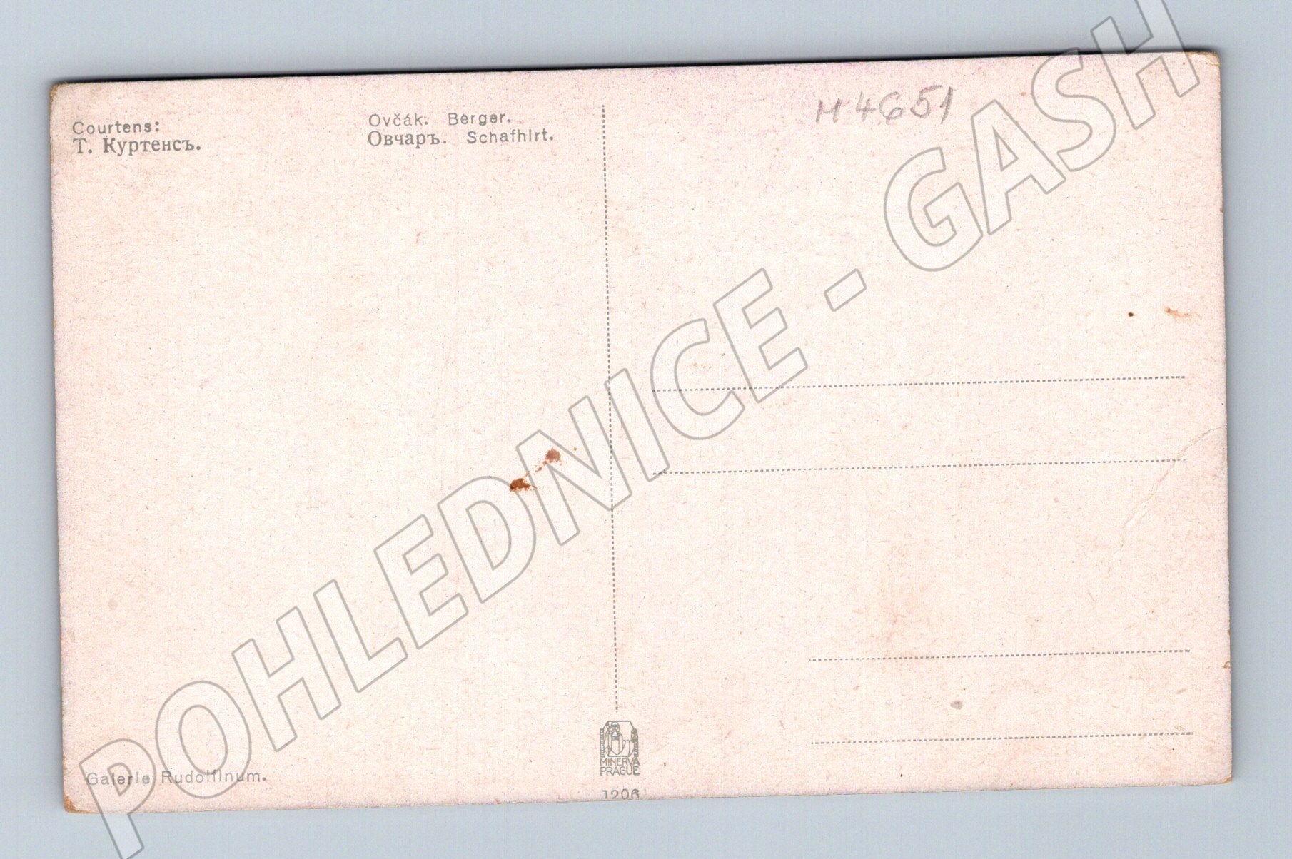 Starší pohlednice s reprodukcí obrazu Ovčák od malíře T. Courtens (Courtens). Pohlednice zachycuje idylickou krajinu s velkým stromem uprostřed a pastevcem se stádem ovcí ve stínu stromů. Tato pohlednice byla vydána Galerií Rudolfinum Praha, pravděpodobně v první polovině 20. století. Na zadní straně pohlednice je uveden autor, popis díla v několika jazycích a nezapsaná adresní část. Výborný sběratelský kousek pro milovníky umění a starých pohlednic.