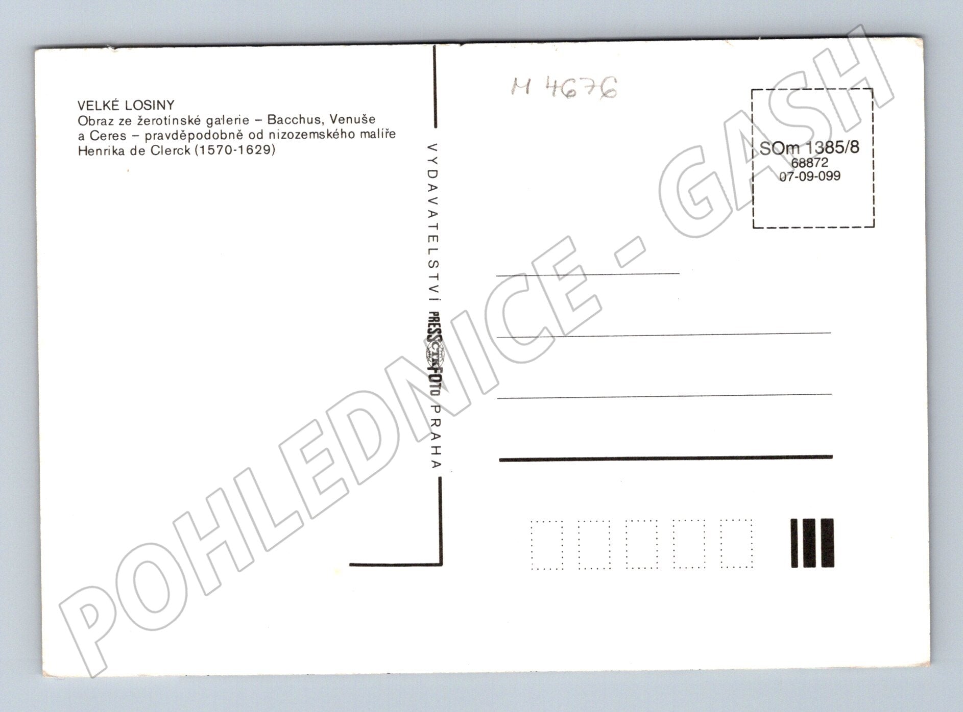 Pohlednice ze série uměleckých děl – Velké Losiny. Přední strana zobrazuje obraz ze žerotínské galerie s názvem Bacchus, Venuše a Ceres, vytvořený pravděpodobně nizozemským malířem Henrikem de Clerckem (1570–1629). Pohlednice je nevypisovaná, ve velmi dobrém stavu, vhodná pro sběratele nebo milovníky umění. Vydavatel: Pressfoto Praha. Skvělý doplněk do sbírky historických uměleckých pohlednic.
