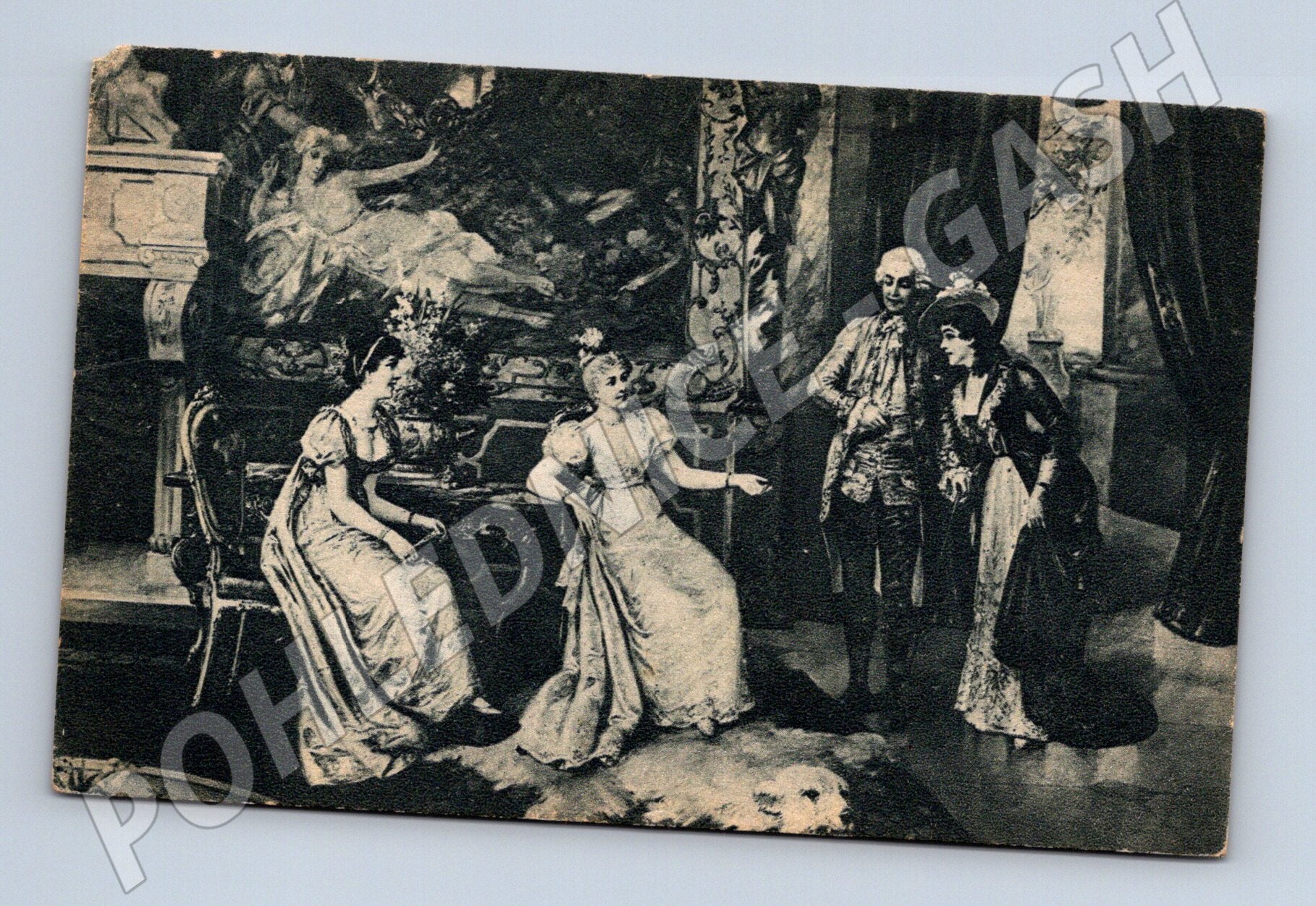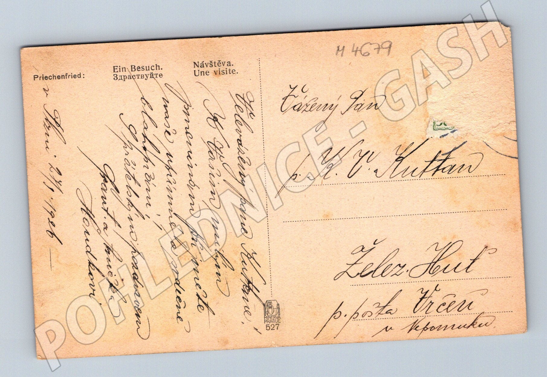Historická pohlednice malého formátu z období před rokem 1950. Na přední straně je zachycena elegantní salonní scéna s několika osobami v dobových šatech, která evokuje atmosféru první republiky nebo počátku 20. století. Zajímavá je kvalitní kresba a umělecké provedení obrázku, které zachycuje dobovou společnost v interiéru s bohatě zdobeným vybavením. Zadní strana je opatřena ručně psaným textem z roku 1906, adresovaným panu Kuttanovi do Želez Hutě u Vrče u Kromníku. Pohlednice je dochována v odpovídajícím stáří, nesená drobnými známkami opotřebení na rozích. Výjimečný doplněk do sbírky starých českých pohlednic a historických suvenýrů.