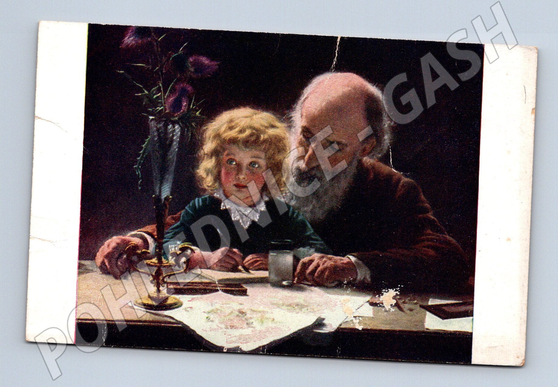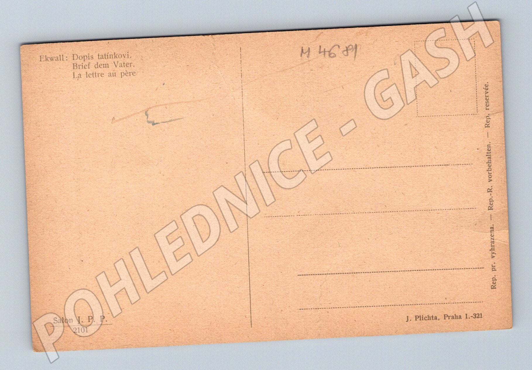 Starší pohlednice s názvem Dopis tatínkovi (Ekwall: Brief dem Vater / La lettre au pere), vydaná salonem J. P. P., č. 2101, vydavatel J. Plichta, Praha. Na pohlednici je malebně vyobrazen vousatý muž a malé dítě, které pravděpodobně píše dopis svému otci. Ve scéně se nachází svíčka a váza s květinami, což dotváří nostalgickou a rodinnou atmosféru. Zadní strana je nepopsaná, s místem na známku a adresu, s vícejazyčným popisem motivu. Pohlednice má mírné opotřebení odpovídající stáří, viz foto.