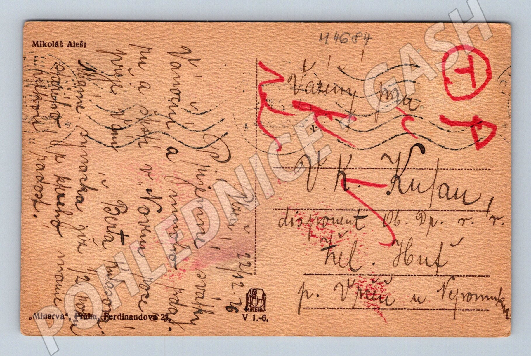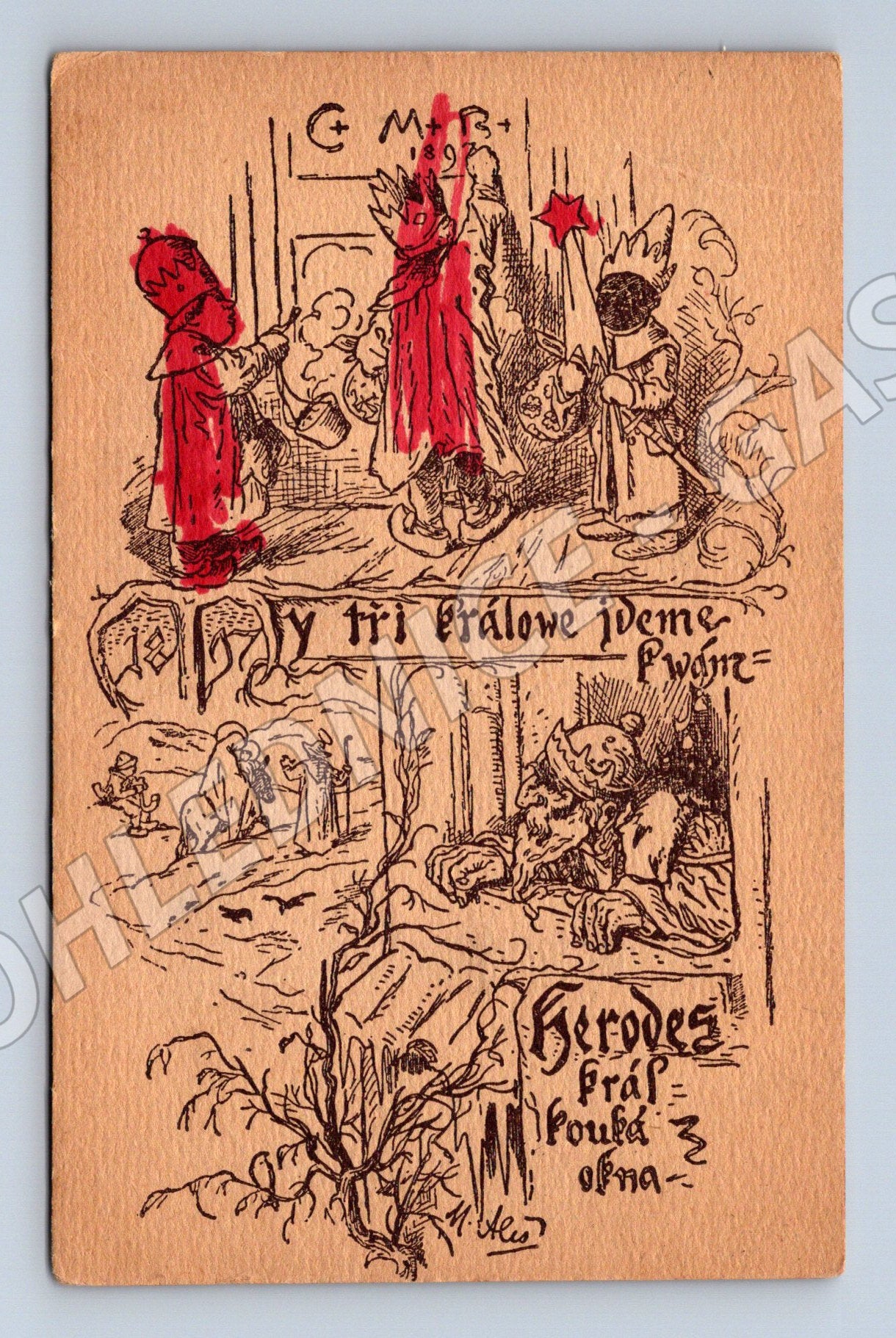 Originální stará pohlednice s ilustrací od Mikoláše Alše, s motivem Tří králů před Herodesem. Jedná se o menší formát pohlednice s typickou historickou kresbou. Pohlednice nese ručně psaný text a známky poštovního provozu. Na přední straně je linoryt s ručním kolorováním červenou barvou, typická tvorba Mikoláše Alše. Vhodné pro sběratele historických českých pohlednic, milovníky ilustrace a umění 19. století. Zachovalý původní stav, známky stáří a poštovního oběhu. Vydavatel: Minerva, Praha, Ferdinandova 21. Raritní sběratelský kousek, který doplní každou kolekci českých historických pohlednic.
