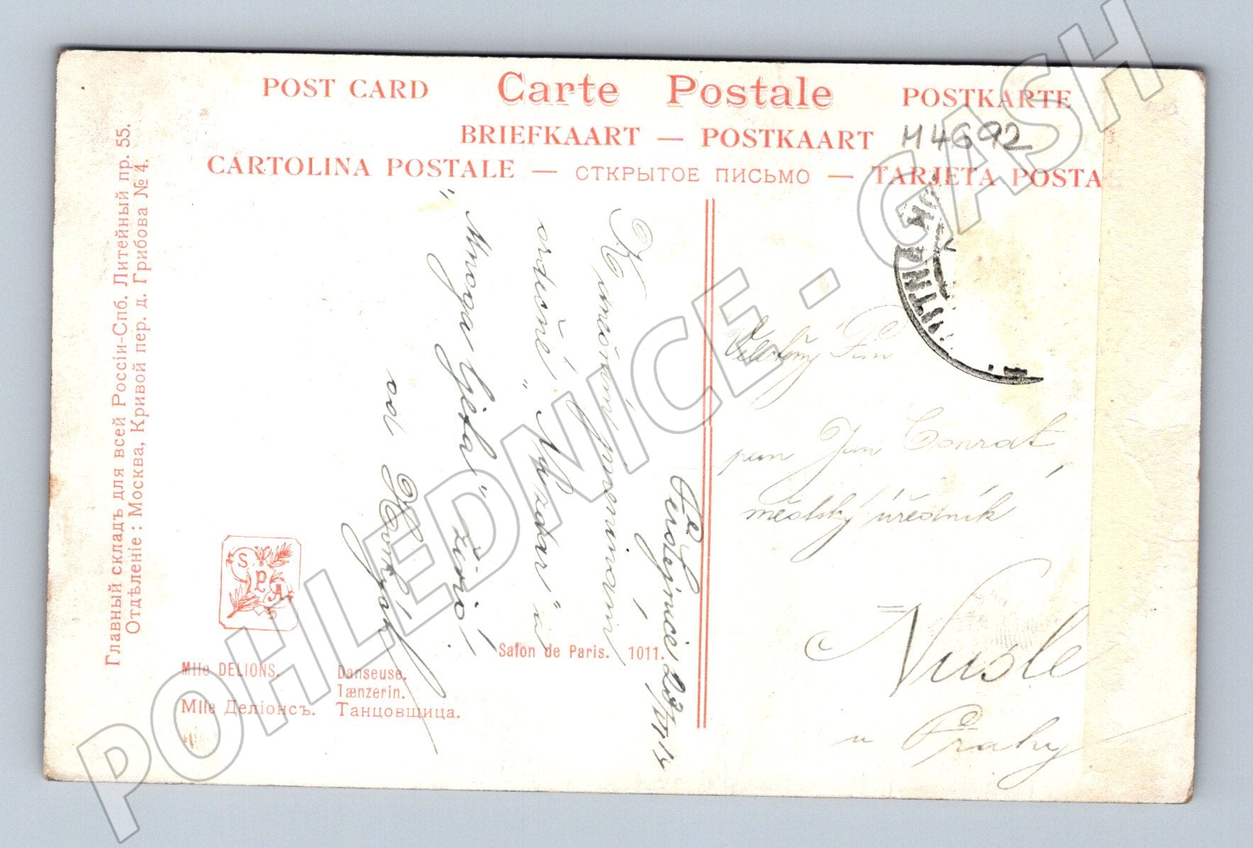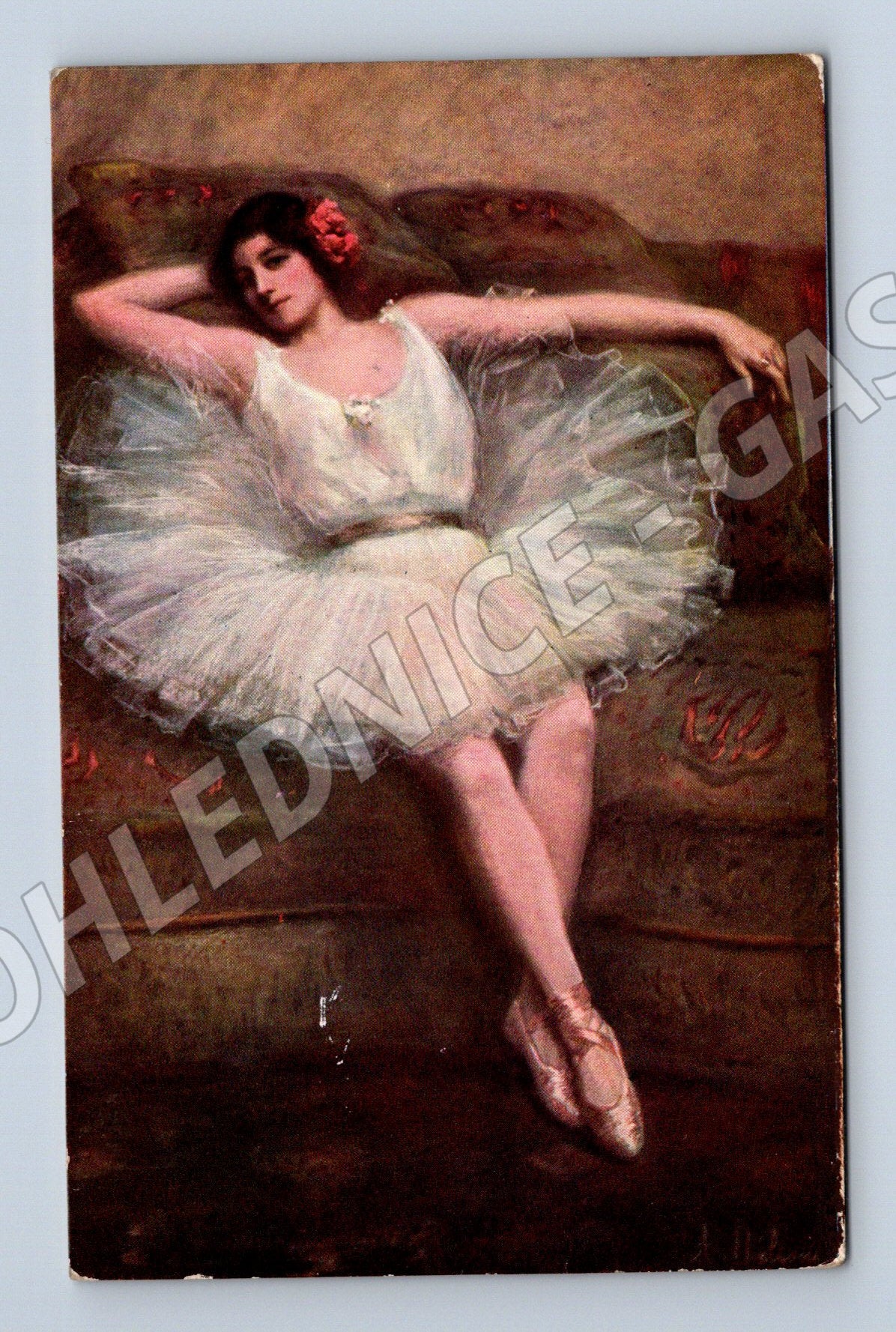 Starobylá pohlednice ve stylu malířského umění, zobrazující baletku v bílé sukni a taneční pozici. Text na zadní straně obsahuje rukopisné věnování a několik nápisů v různých jazycích (francouzsky, rusky). Pohlednice je opatřena známkami běžného opotřebení dle stáří, avšak v dobrém stavu a vhodná do sbírky. Zajímavý kousek pro milovníky tance, baletu a současně i historických pohlednic nebo malířství. Ideální pro sběratele s důrazem na baletní motivy a umělecká ztvárnění.