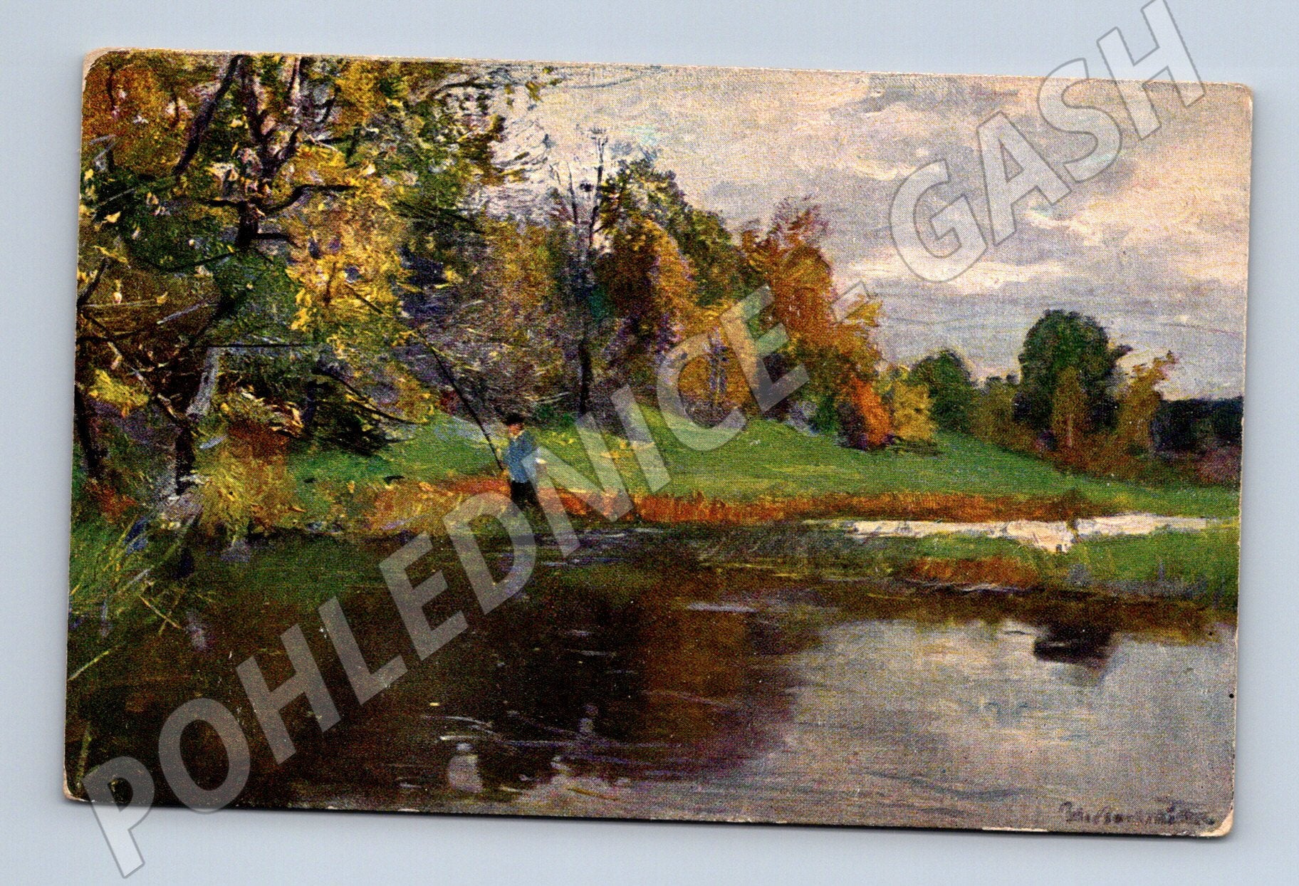 Nabízím originální starou pohlednici s malovaným motivem krajiny u rybníka. Pohlednice zachycuje podzimní scenérii s postavou rybáře u klidné vodní hladiny a vzrostlými stromy v pestrých barvách. Jedná se o umělecký tisk, na zadní straně je univerzální předtisk pro adresu a text, nese označení Postkarte - Carte Postale - Union postale universelle . Pohlednice je neprošlá, v dobrém zachovalém stavu, vhodná pro sběratele malířských pohlednic či milovníky krajinomalby. Přibližné stáří dle stylu výroby první polovina 20. století.