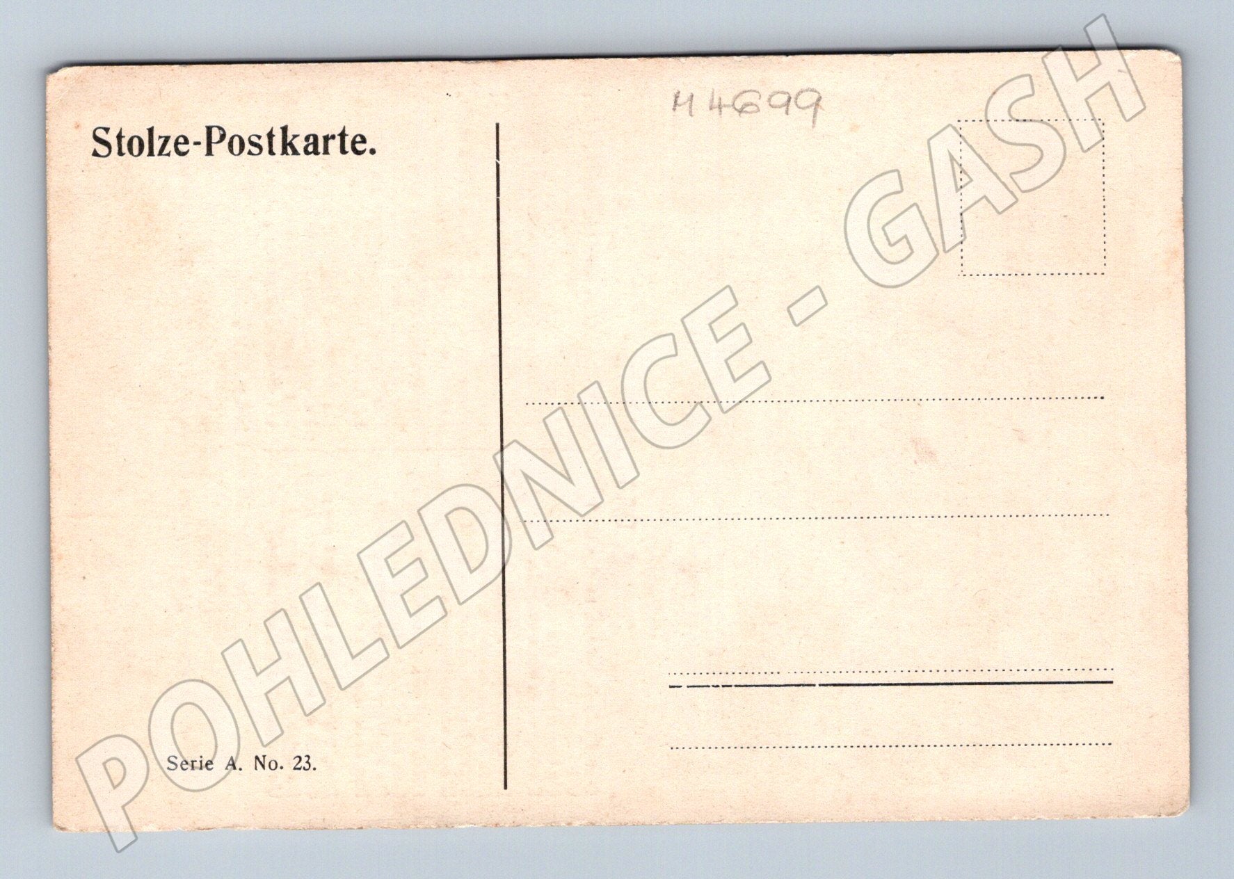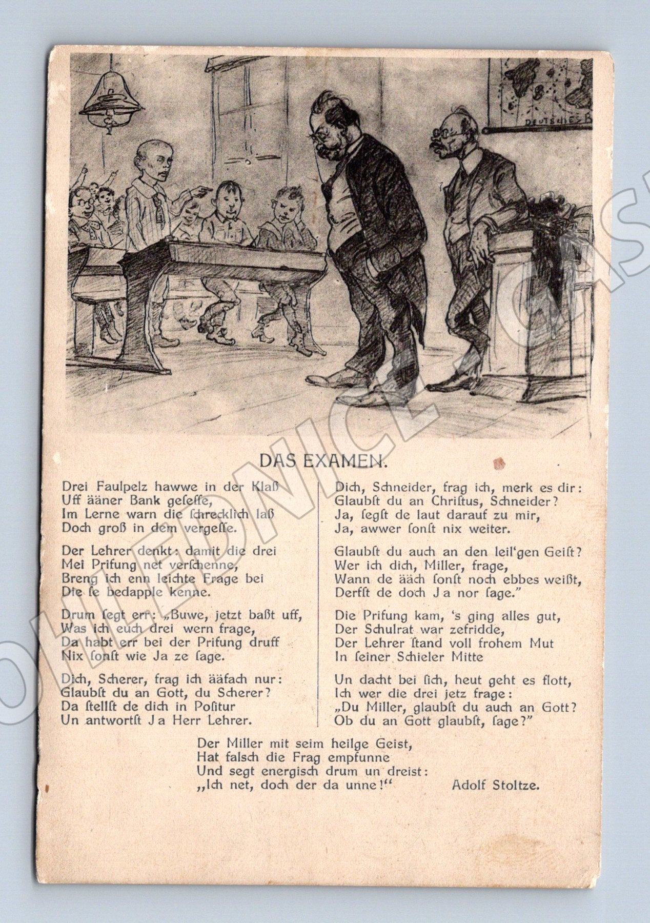 Starší německá pohlednice s názvem DAS EXAMEN , na přední straně je kreslená humorná scéna z třídy během zkoušení dětí učitelem. Vpravo vedle ilustrace je dlouhý německý text (báseň od Adolfa Stolze), který vtipně popisuje situaci při zkoušení ve škole. Zadní strana pohlednice obsahuje rubriku pro adresu a známku, s označením Stolze-Postkarte a číslováním Serie A. No. 23. Pohlednice je ve slušném stavu, s jemnými stopami stáří, drobné zašpinění po okrajích a číslo tužkou v rohu. Skvělý sběratelský kousek pro milovníky německé školní satiry nebo starých pohlednic.