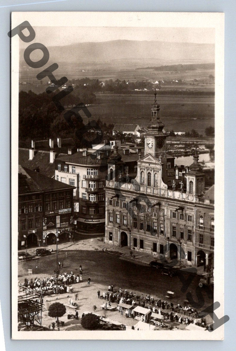 Nabízím autentickou historickou pohlednici města České Budějovice. Na pohlednici je černobílý fotografický záběr znázorňující centrum města s výraznou hodinovou věží a okolní architekturou. Na snímku jsou vidět i lidé a automobily dobové doby, což dodává pohlednici jedinečnou atmosféru a historickou hodnotu. Pohlednice je v dobrém stavu, bez větších poškození, ideální pro sběratele nebo milovníky historie českých měst. Na zadní straně je vytištěný nápis ČESKÉ BUDĚJOVICE. a název tiskárny Graflte V. Chmeliček, Plzeň Husova 67.