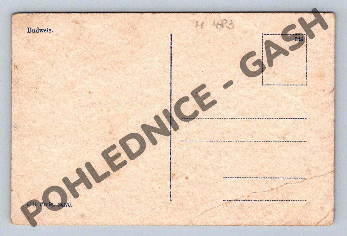 Tato stará černobílá pohlednice zachycuje historické náměstí s dominantní kašnou a okolními budovami v městě Budweis (České Budějovice). Pohlednice pochází z doby dřívější a je v zachovalém stavu s viditelnými opotřebeními, jako jsou ohyby a menší trhlinky. Na zadní straně pohlednice je natištěna adresa a místo pro známku, ovšem je nepopsaná. Originální historický dokument zobrazující městskou architekturu a atmosféru minulých dob, vhodný pro sběratele a milovníky historie měst a jejich památek.