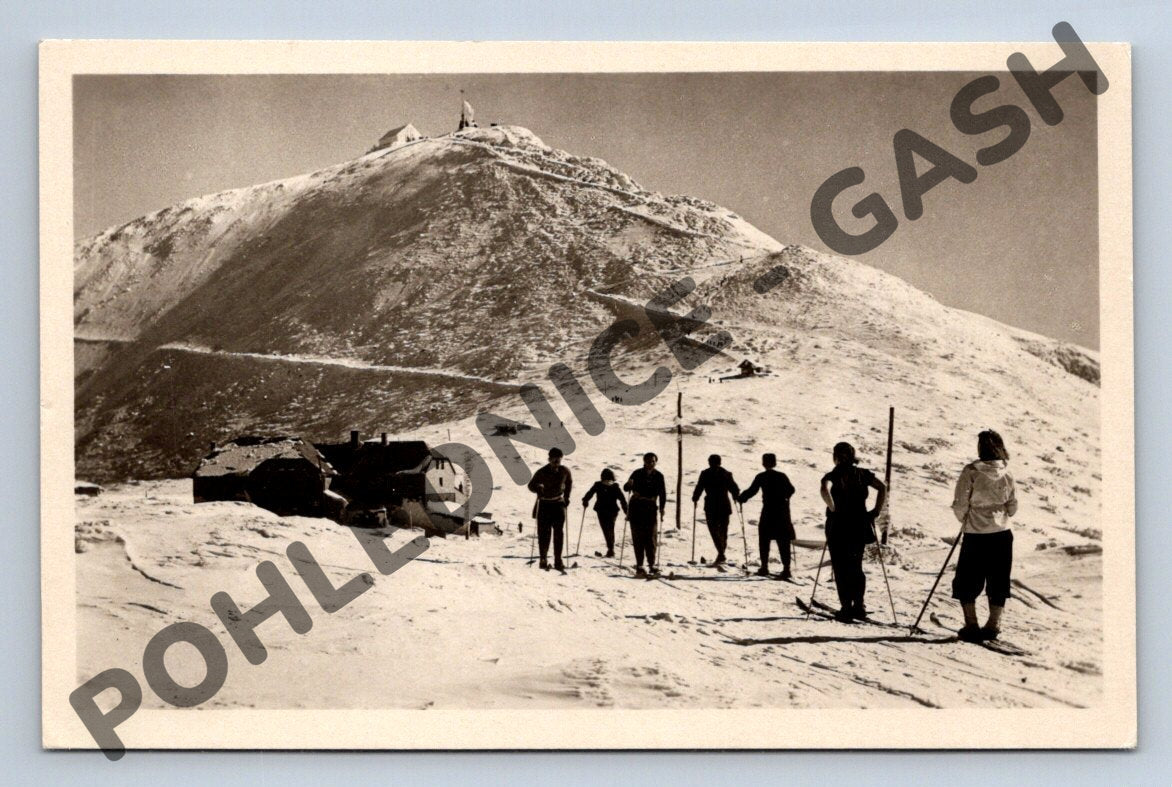 Nabízím zachovalou starou pohlednici Krkonoš se zimní scenérií na Sněžce s Obří boudou. Pohlednice je černobílá, zobrazuje skupinu lyžařů na zasněžené hoře, typickou atmosféru horské turistiky a zimních sportů v Československu. Na rubové straně je uvedeno: Krkonoše - Sněžka - Obří bouda , vydavatel ORBIS, cena 2,50 Kčs. Pohlednice je vhodná pro sběratele starých pohlednic, milovníky hor a zimních sportů nebo jako dekorace s historickou tématikou. Formát je malý, pravděpodobně z první poloviny 20. století.