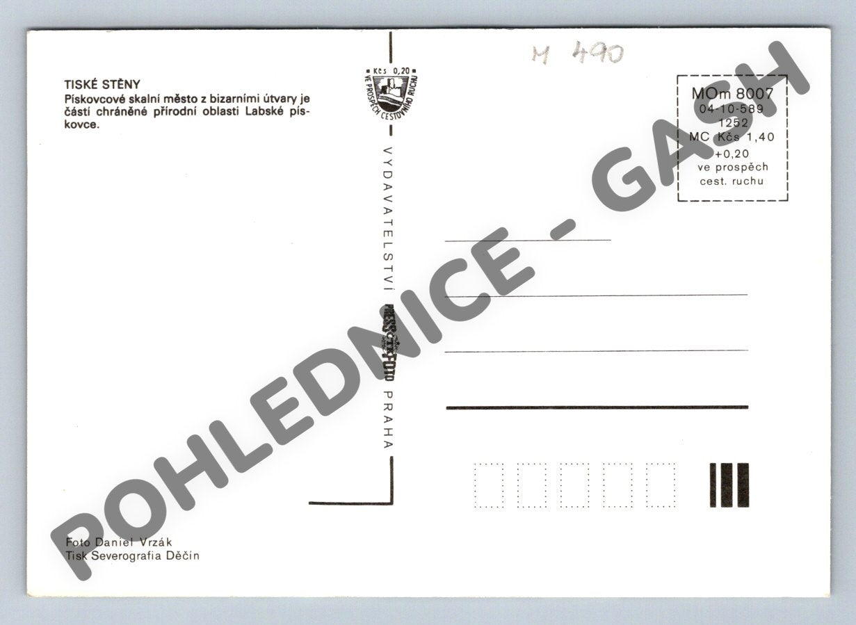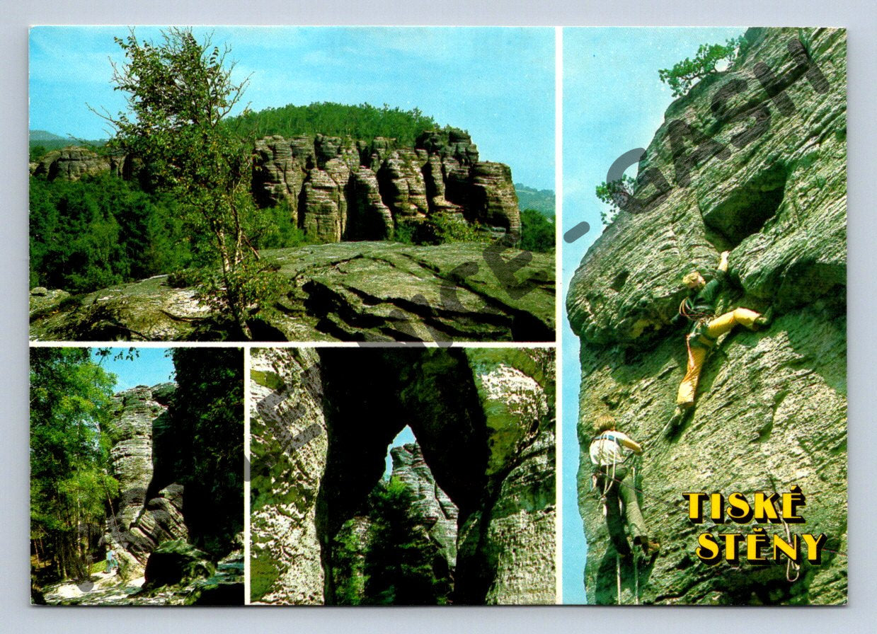 Tato pohlednice zachycuje Tiské stěny, známé pískovcové skalní město se zajímavými bizarními útvary. Tato lokalita je součástí chráněné přírodní oblasti Labské pískovce a je oblíbeným místem pro turisty i horolezce. Na pohlednici jsou vidět jak panoramatické záběry skal, tak i skalní lezení, které dokumentuje aktivní trávení volného času v této přírodní scenérii. Pohlednice je vydána Vydavatelstvím Pressfoto Praha s fotografií od Daniela Vrzáka. Na zadní straně je klasické rozdělení pro adresu a zprávu, včetně označení ceny v Kčs a použití státního razítka. Ideální pro sběratele pohlednic přírody a milovníky českých skalních oblastí.