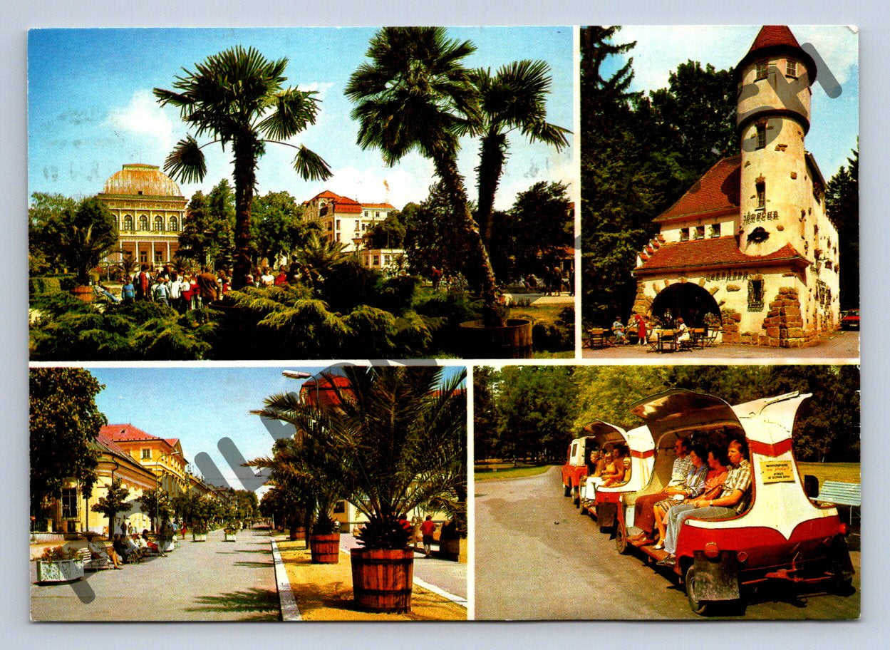 Pohlednice zobrazuje různé pohledy z Františkových Lázní, známého lázeňského města v České republice. Na přední straně jsou čtyři barevné fotografie - park s palmami a lidmi, historická věž, lázeňská ulice s lavičkami a palmami a výletní vláček s lidmi. Na zadní straně je ručně psaný vzkaz a známka Československa s portrétem. Pohlednice je tištěna Severografií v Děčíně a podepsaná fotografy J. Kruliš a J. Rajzík. Výborný stav, zajímavý sběratelský kousek z období socialistického Československa.