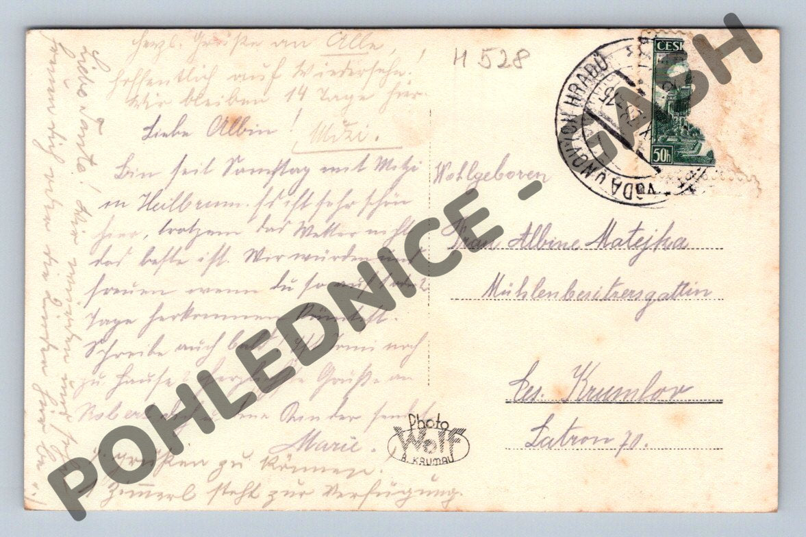 Tato historická pohlednice znázorňuje poutní místo Mariánská Týnice, jedno z nejvýznamnějších barokních sakrálních komplexů v Čechách. Na přední straně je vyobrazena podoba poutního kostela v Mariánské Týnici a figura Panny Marie s dítětem, obklopená andělíčky, doplněná nápisem AUGENKEM MARIAN TÝNOSTI . Pohlednici lze datovat do první poloviny 20. století, což dokládá i poštovní razítko a známka z období Československa. Zadní strana obsahuje ručně psaný text v němčině a adresu adresáta v Krumlově. Pohlednice je v dobrém stavu vzhledem ke svému stáří, s drobnými stopami opotřebení. Výborný sběratelský kousek pro zájemce o české historické a sakrální památky, nebo milovníky starých pohlednic. Ideální doplněk do sbírky pohlednic z oblastí s významnými památkami a poutními místy v ČR.