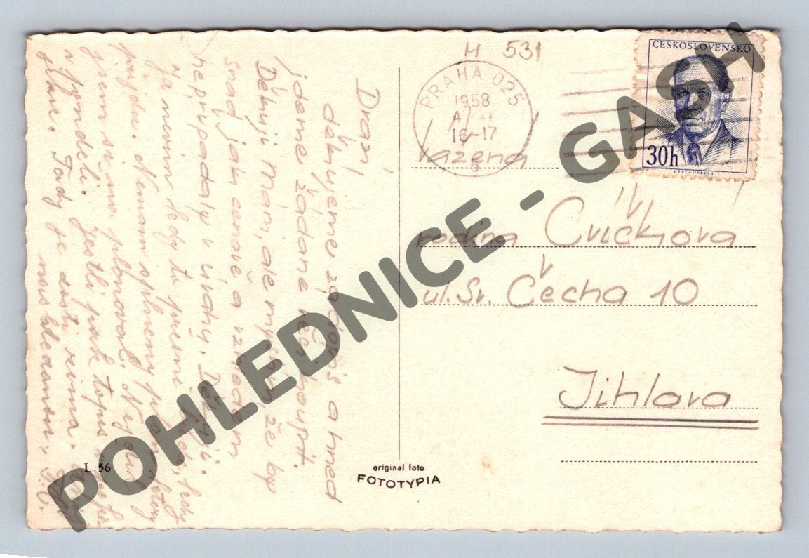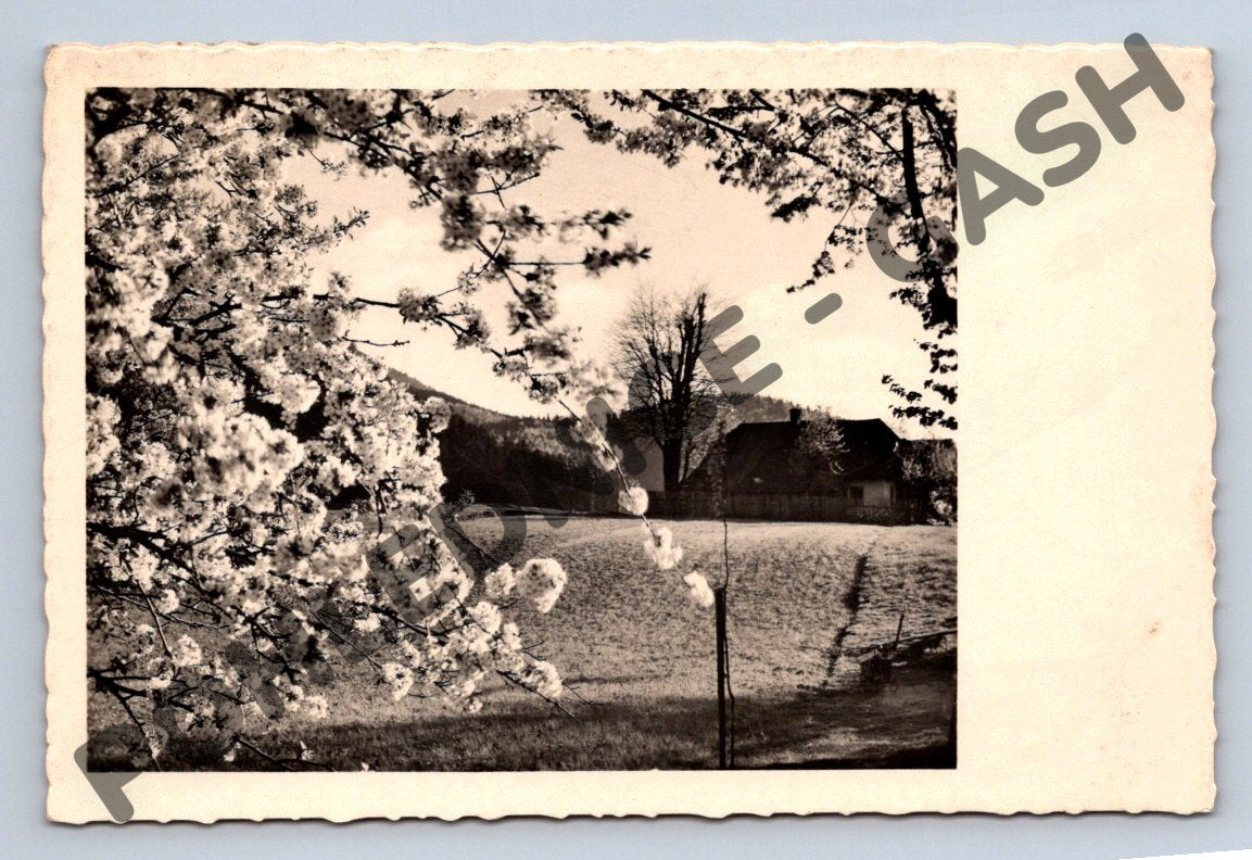 Starší černobílá pohlednice z Československa zobrazující jarní krajinu s kvetoucími stromy a domem na pozadí. Pohlednice je zachovalá, s lehce zvlněnými okraji typickými pro starší tisk. Na zadní straně je rukopisný dopis datovaný rokem 1958, známka a poštovní razítko z Prahy. Jedná se o autentický sběratelský kousek z období první poloviny 20. století, vhodný pro milovníky historie a vintage pohlednic. Originální tisk, označení FOTOTYPIA a číslo L56.