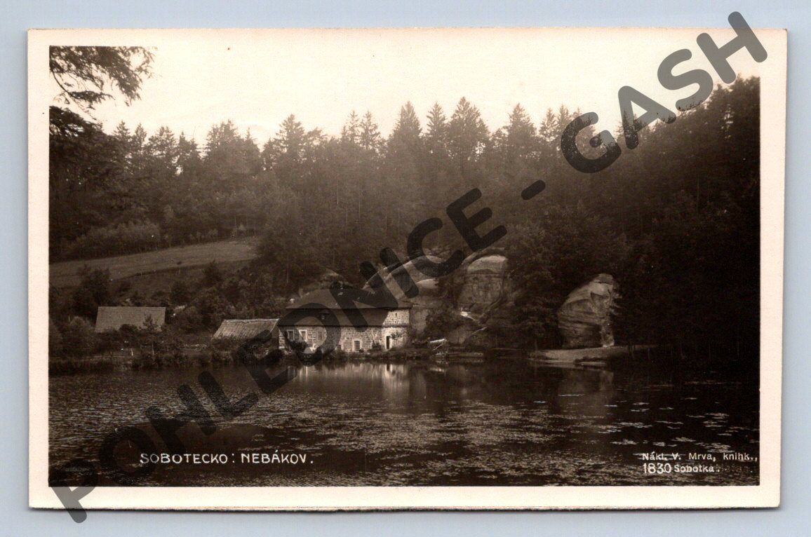 Tato stará pohlednice zachycuje malebnou scenérii z oblasti Sobotecko - Nebákov, konkrétně pohled na rybník s přilehlými domy a skalnatým lesním pozadím. Fotografie je černobílá a pochází z doby do roku 1950, což dokládá její historickou hodnotu. Pohlednice nese nápis Nákl. V. Mrva, knihtl., 1830 Sobatka . Na zadní straně je jednoduchý motiv parní lokomotivy, což je vhodná grafická tečka z hlediska dobové estetiky. Pohlednice je ideální pro sběratele starých pohlednic z Česka a milovníky krajinářské fotografie z minulých desetiletí.