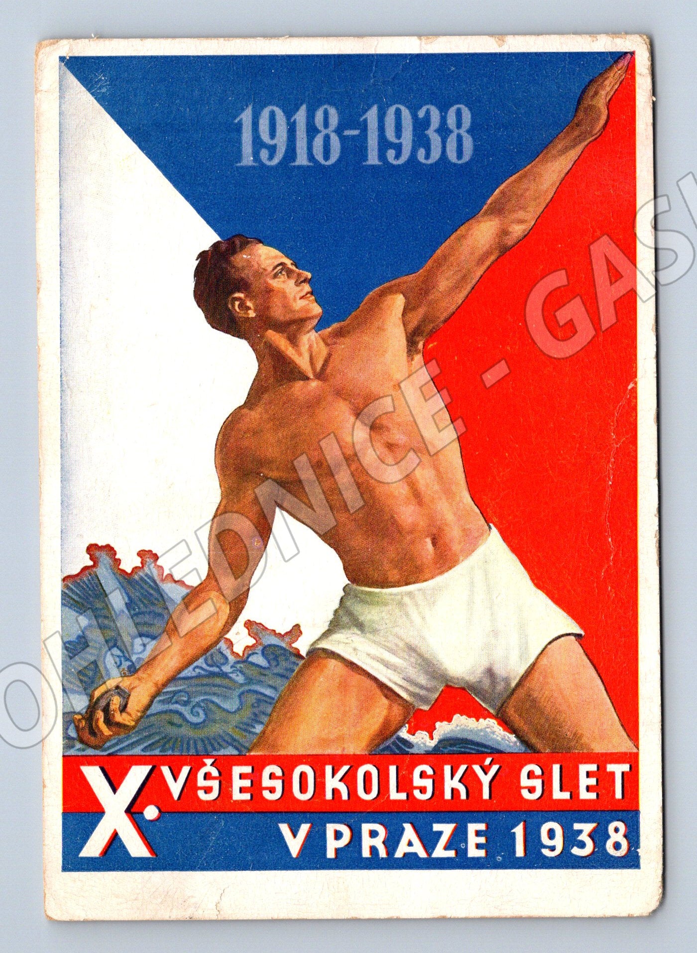 Originální pohlednice z X. Všesokolského sletu v Praze z roku 1938, vydaná k 20. výročí vzniku Československa (1918–1938). Na přední straně je vyobrazen silueta sportovce v dynamické póze na barevném pozadí s motivem československé vlajky. Vlevo je sloup s nápisem „X. všesokolský slet v Praze 1938“, vpravo letopočet 1918–1938. Zadní strana pohlednice obsahuje ručně psaný text, poštovní razítko AUTOPŠTA 26.VI.38 a označení knihkupectví a nakladatelství ČOS, Praha III., Tyršův dům. Pohlednice je v pěkném sběratelském stavu, vhodná pro sběratele historických pohlednic, sokolských památek a československé historie.