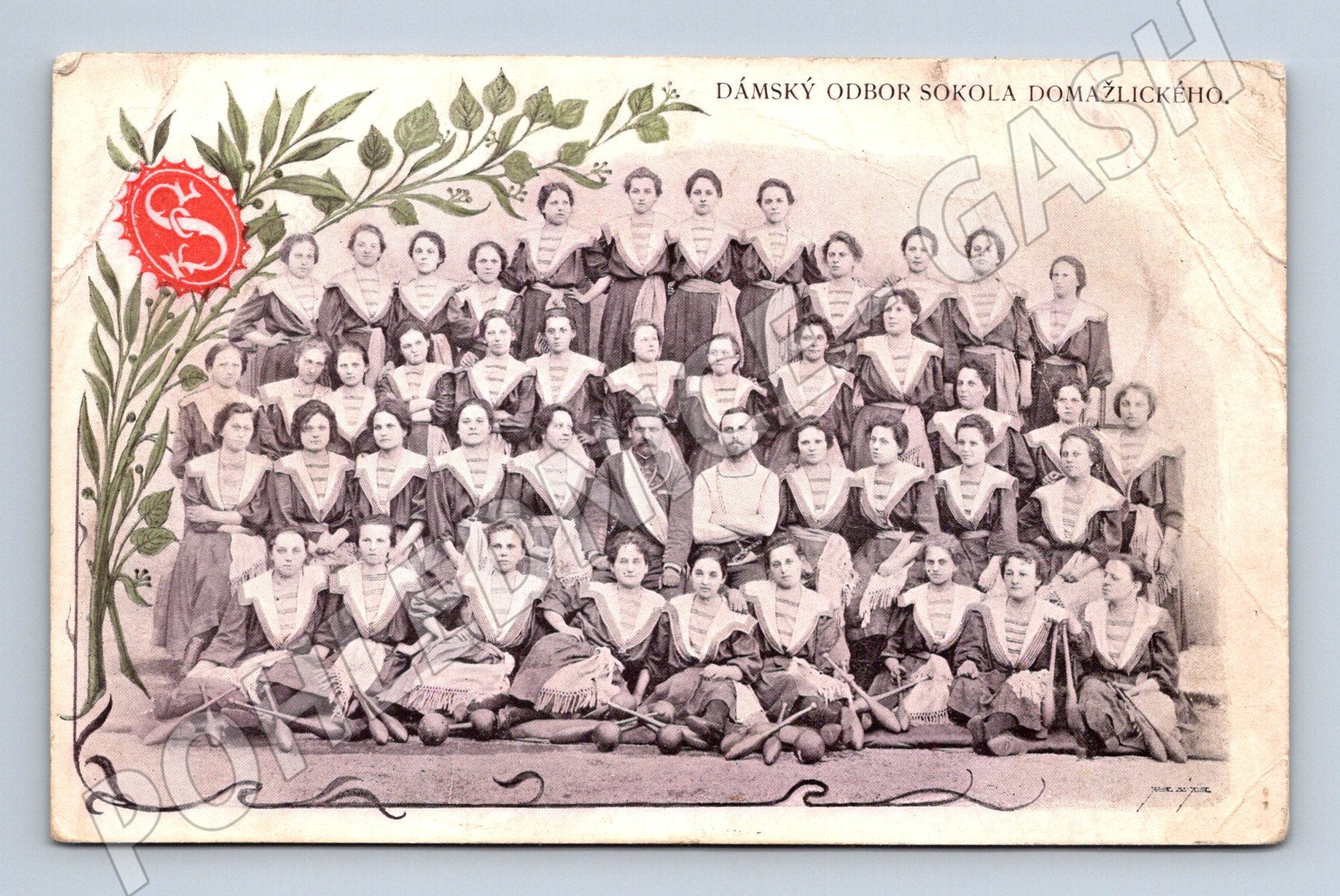 Starý originální pohled - Dámský odbor Sokola Domažlického. Přední strana zachycuje hromadný portrét ženské části sokolského spolku v dobových krojích, včetně učitele, s typickou secesní výzdobou. Vlevo je výrazná červená známka se S a věncovou výzdobou. Tisk: Edvard Leschinger, Praha. Pohlednice je ve sběratelském stavu s patrnými stopami stáří, zažloutnutím a drobným poškozením rohů, což je patrné na fotografii. Zadní strana neprošlá poštou, s původní čitelnou cenou tužkou. Ideální k doplnění sbírky českých pohlednic z období před rokem 1950 nebo jako historický dokument sokolského hnutí.