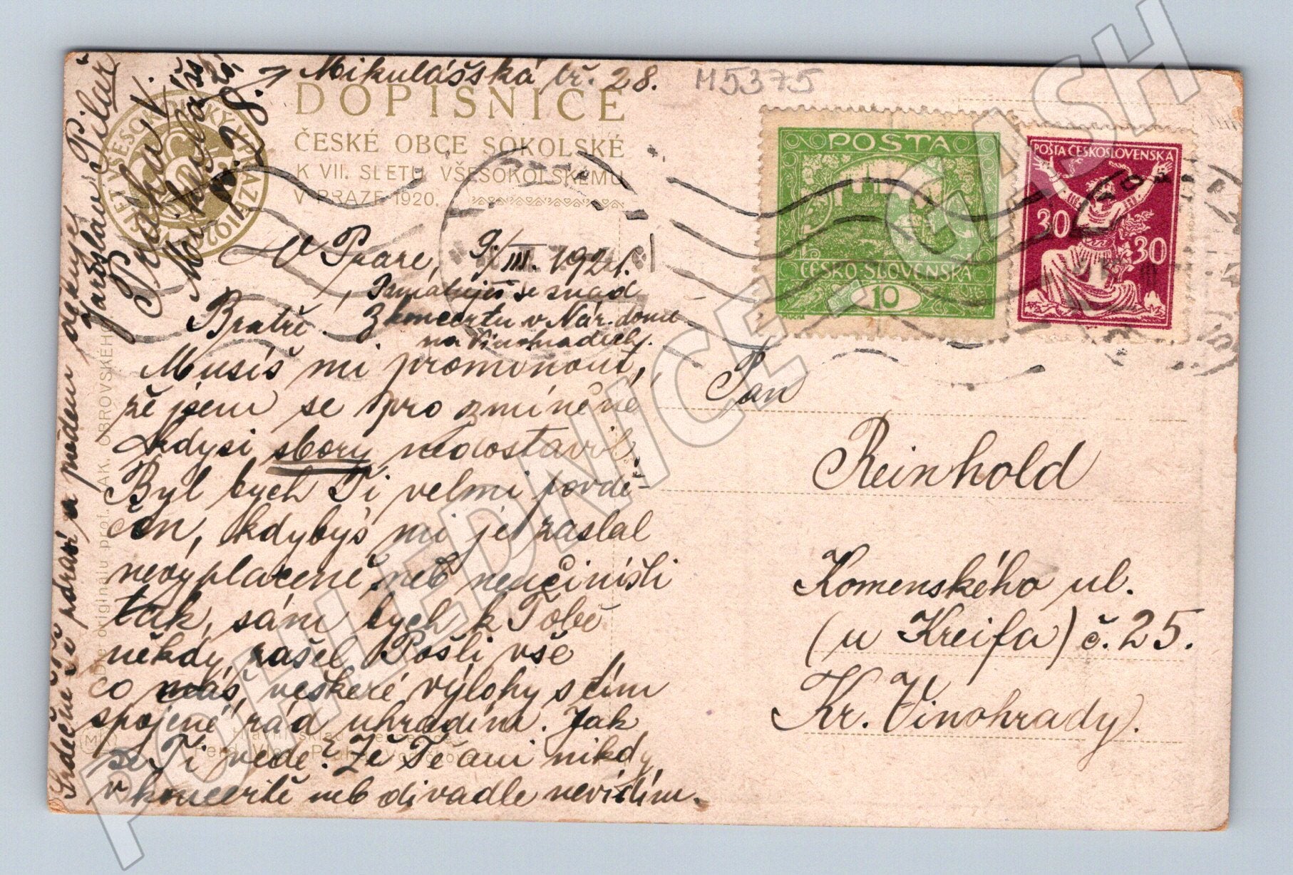 Originální pohlednice ze 7. všesokolského sletu, který se konal v Praze v roce 1920. Na přední straně pohlednice je výrazné barevné umělecké vyobrazení s nápisem SEDMÝ SLET VŠESOKOLSKÝ V PRAZE . Zadní strana je popsána a opatřena dobovými známkami (10 haléřů a 30 haléřů), jakož i poštovním razítkem. Pohlednice nás poutavě zavádí do atmosféry jedné z nejvýznamnějších tělocvičných akcí první republiky. Velmi zajímavý sběratelský kus s autentickou dobovou patinou, vhodný pro milovníky historie ČR, Sokolů nebo starých pohlednic. Stav odpovídá stáří – viz foto.