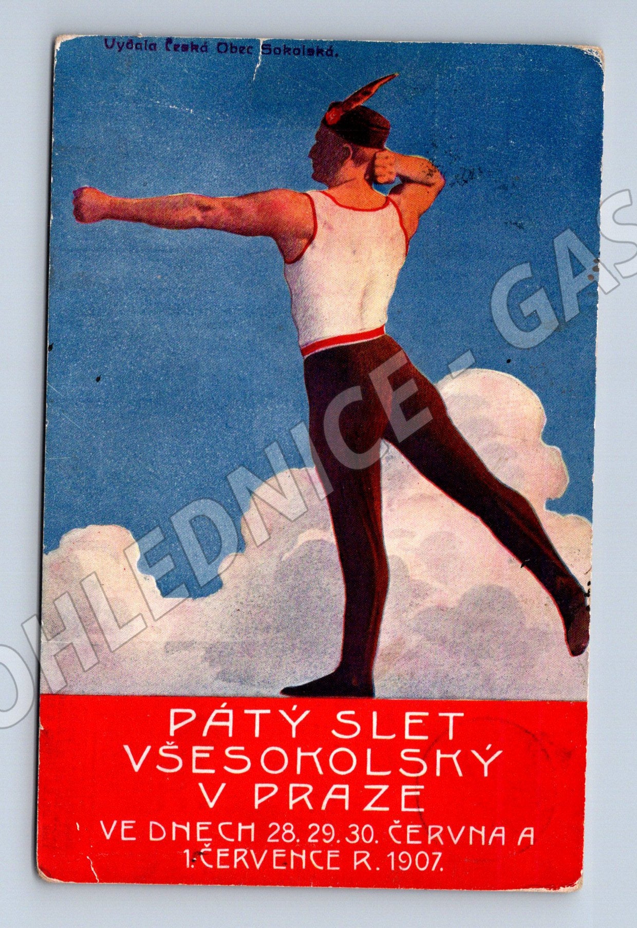 Pohlednice Pátý všesokolský slet Praha 1907, malý formát, použité