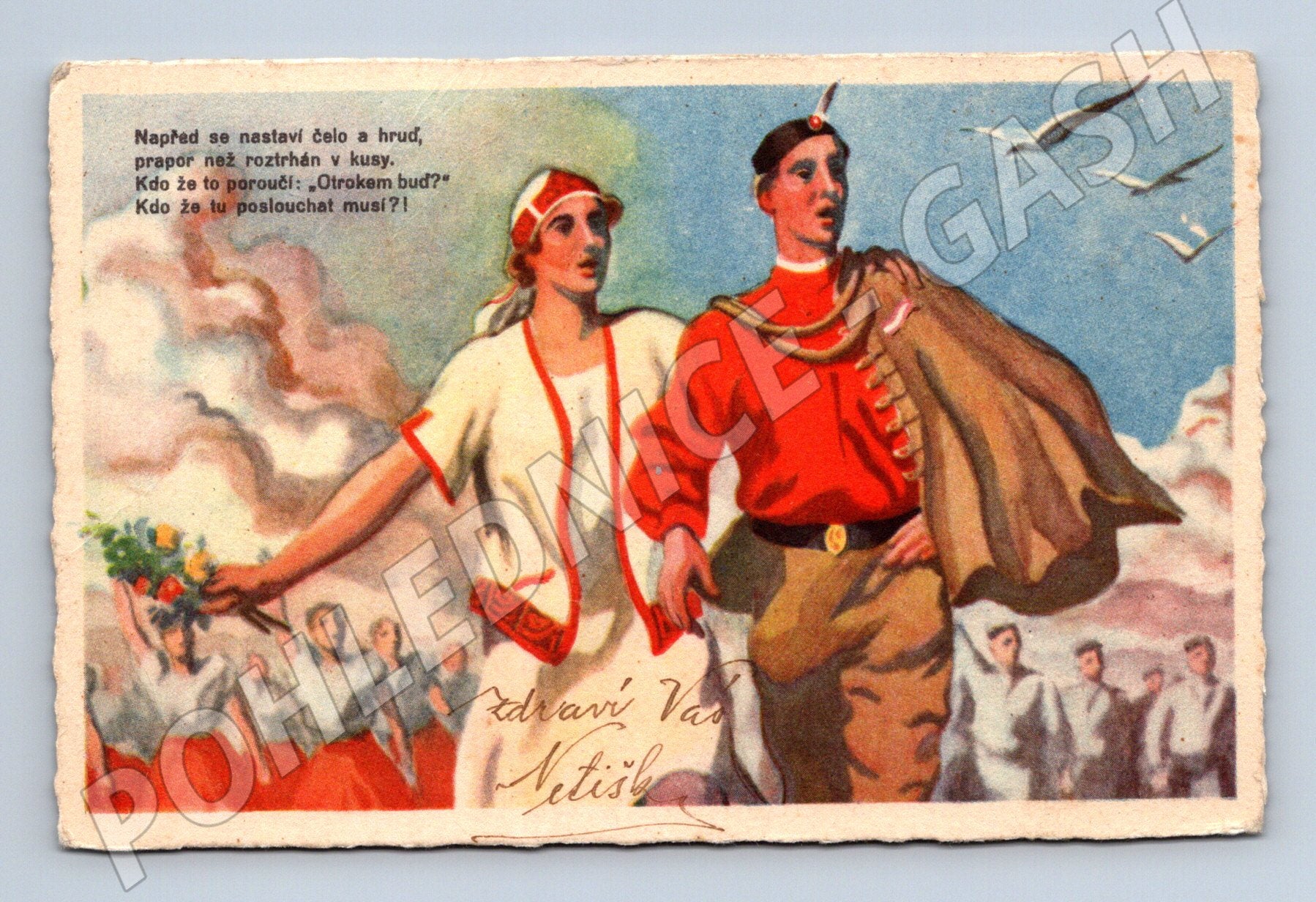 Starší česká pohlednice malého formátu s vlasteneckým motivem a působivou básní. Na lícové straně je barevná ilustrace muže a ženy v tradičním kroji s rudým praporem, v pozadí jsou další postavy a letící ptáci. Nahoře je tištěná báseň povzbudivého nacionalistického zabarvení. Pohlednice je ručně popsána na zadní straně a nese známky stáří – mírně ohnuté růžky, patina a drobné opotřebení. Vhodné pro sběratele historických pohlednic z období před rokem 1950, zajímavý doklad dobového umění a vlastenecké propagandy.