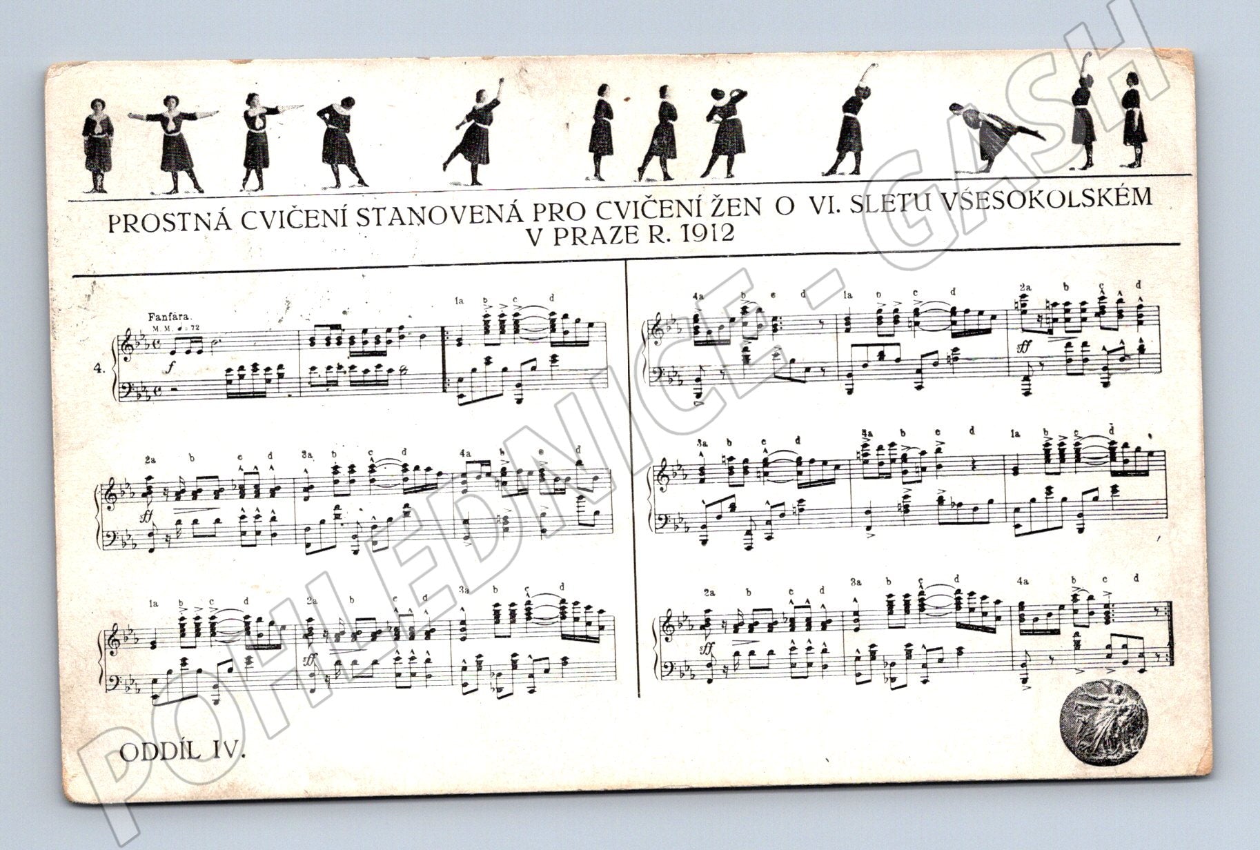 Pohlednice VI. všesokolský slet Praha 1912, prostná cvičení žen, noty