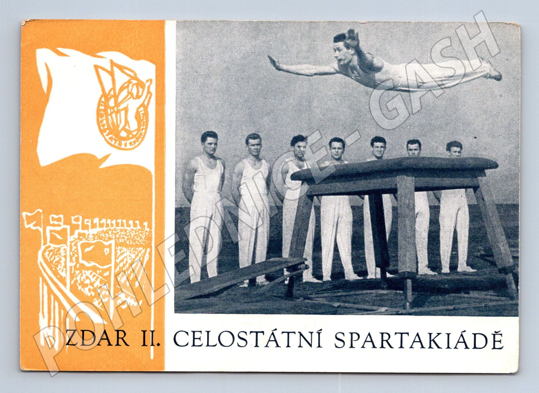 Originální pohlednice z období II. celostátní spartakiády v tehdejším Československu, zobrazující mužské gymnastické vystoupení na venkovním stadionu. Na přední straně pohlednice je zobrazen gymnastický prvek na koni, v pozadí stojí další cvičenci v bílém úboru. Vlevo grafický motiv spartakiádních symbolů a zaplněného stadiónu s vlajkami. Pohlednice je čistá, bez popisu, ve velmi dobrém stavu. Krásné dobové svědectví o sportovních událostech a tělovýchově v Československu. Vydala Názorná agitace se štábem ÚV ČS PŘJ INO. Ojedinělý sběratelský kus s historickou hodnotou.