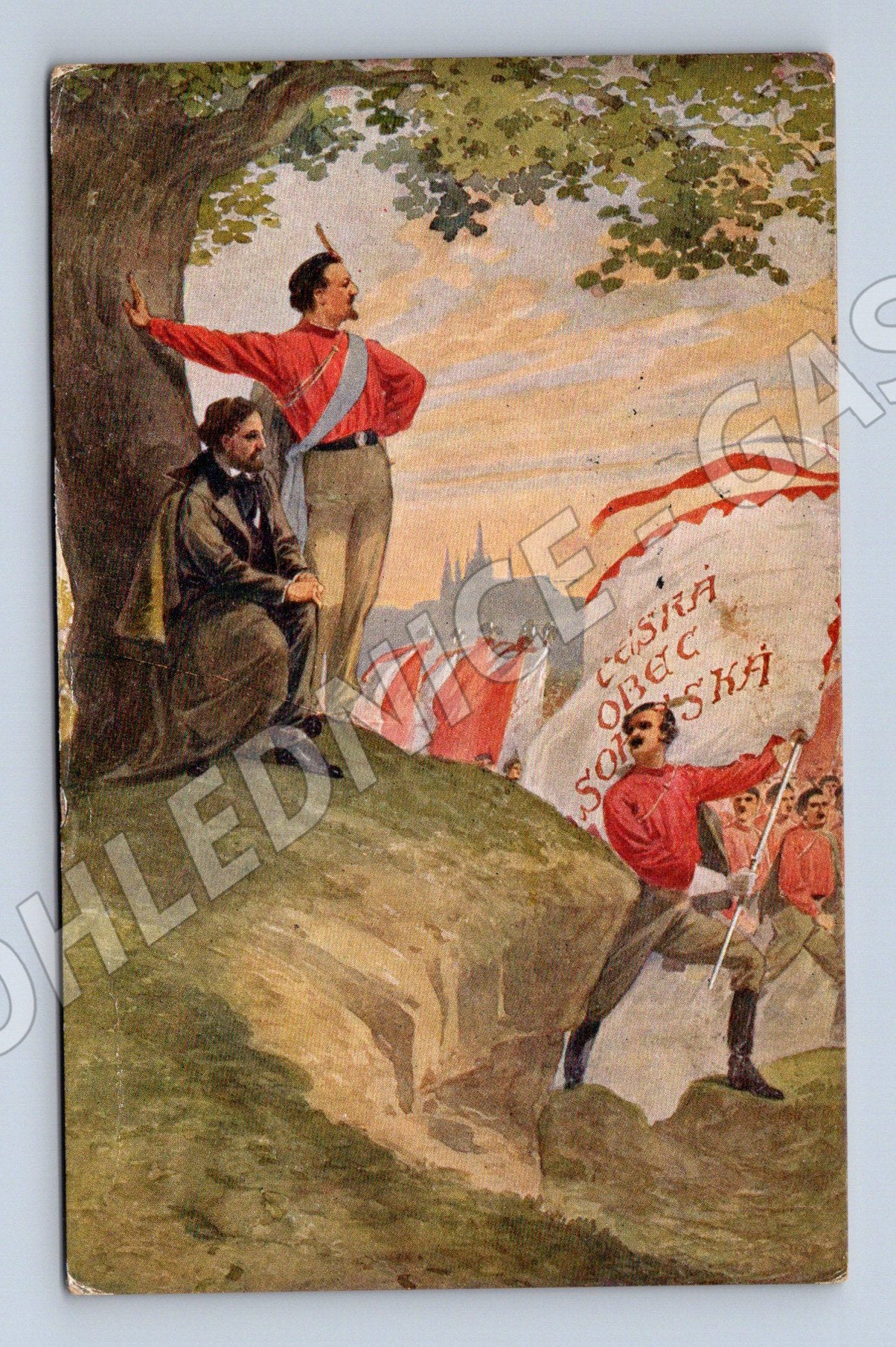 Historická pohlednice z českého prostředí s motivem barikády a revolučních událostí 19. století, pravděpodobně inspirovaná Sokolskými nebo národně obrozeneckými motivy. Pohlednice je prošlá poštou, na zadní straně ručně psaný text a československá poštovní známka s portrétem. Pohlednice pochází z období první republiky či konce Rakousko-Uherska. Skvělý sběratelský kus dokumentující tehdejší národní atmosféru. Stav viz foto, lehké opotřebení odpovídající stáří.