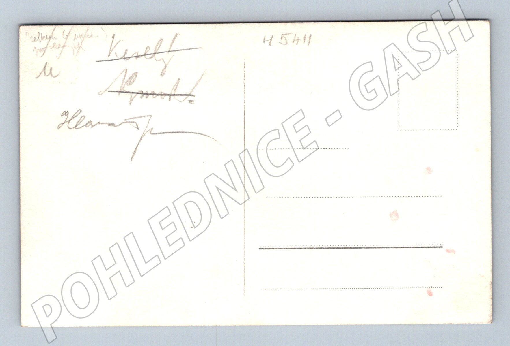 Originální černobílá pohlednice malého formátu z období před rokem 1950. Na přední straně je zachycena skupina mužů a žen ve společenském oblečení, pravděpodobně při skupinovém setkání nebo slavnosti. Fotografie byla pořízena na dlážděné ulici s historickými budovami v pozadí. Pohlednice je na zadní straně nepopsaná, jen s ručně psanými poznámkami a podpisy. Velmi zajímavý dobový dokument, vhodný do sbírky historických pohlednic z českých zemí.