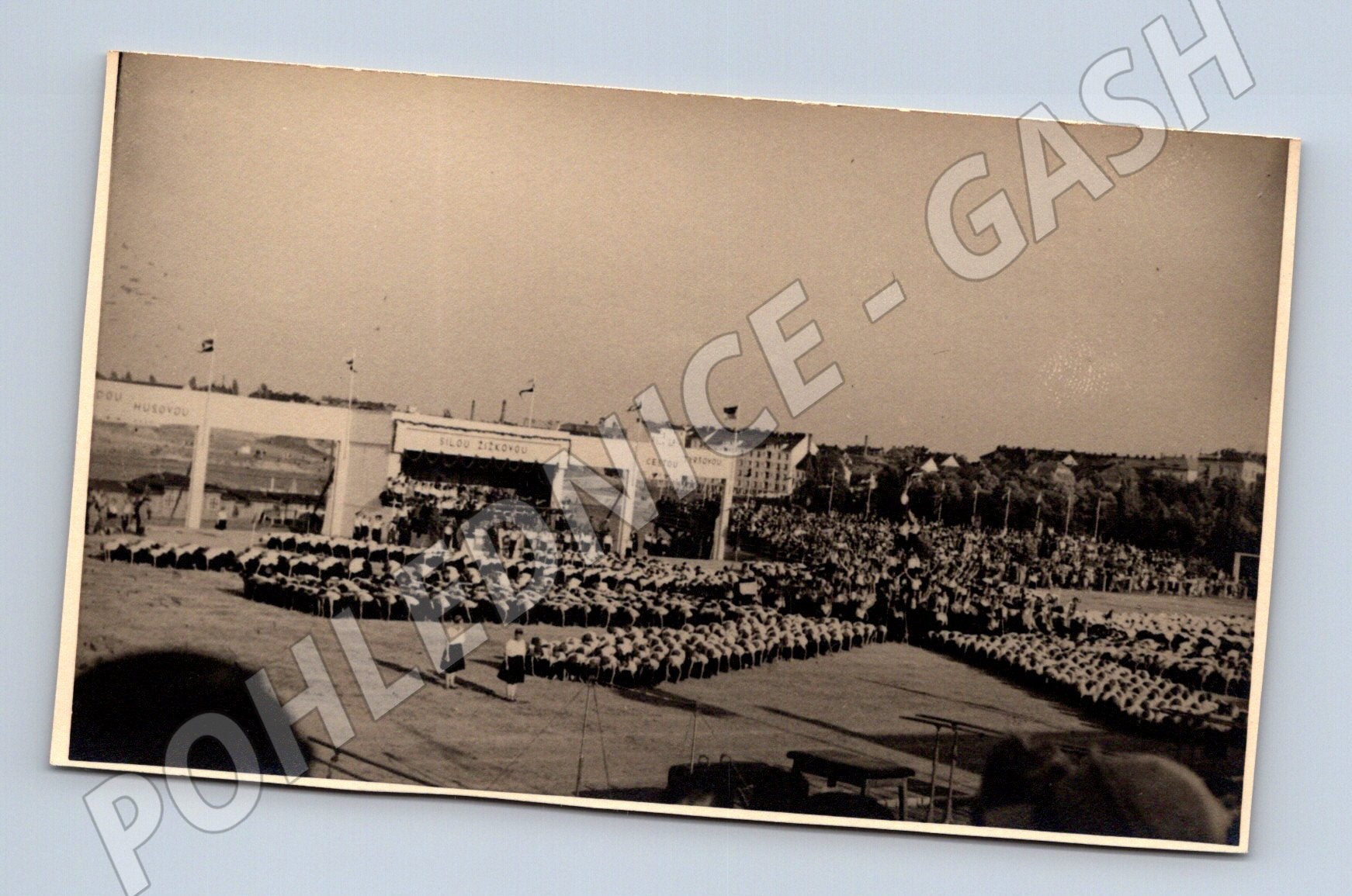 Originální černobílá pohlednice menšího formátu ze sbírky, zobrazující velkou veřejnou slavnost nebo sokolský slet na stadionu s masovým cvičením. Na pódiu v pozadí jsou patrné transparenty a tribuny zaplněné diváky. Stav pohlednice je dobrý, s drobnými známkami stáří a opotřebení. Zadní strana je nepopsaná, pouze s vytištěným logem a označením M 5412. Jedná se o dobový dokument české historie vhodný do sbírky nebo k vystavení. Ideální pro sběratele starých pohlednic, zájemce o Českou republiku a zachycení kulturních událostí minulého století.