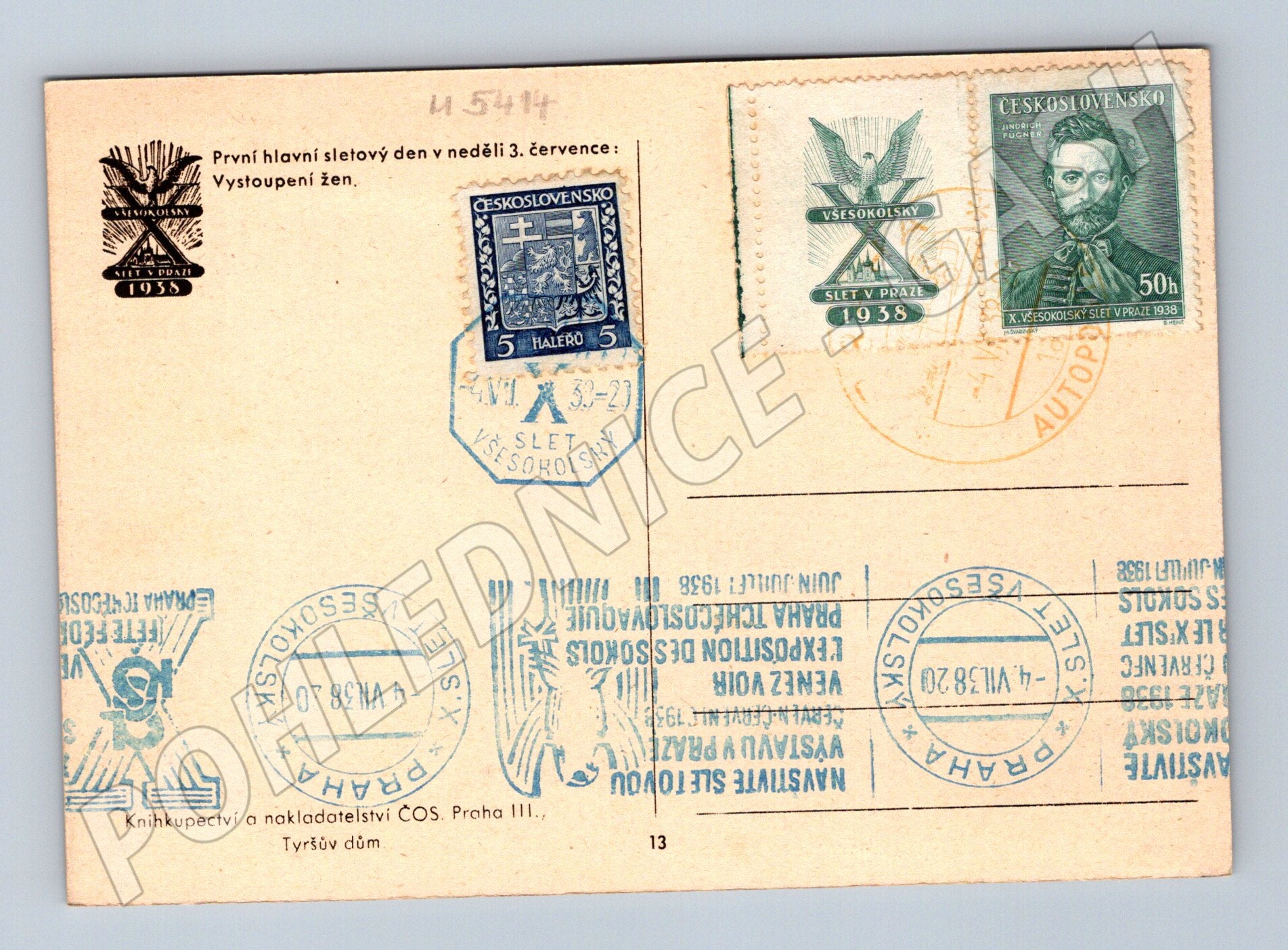 Pohlednice Všesokolský slet Praha 1938, vystoupení žen, razítka