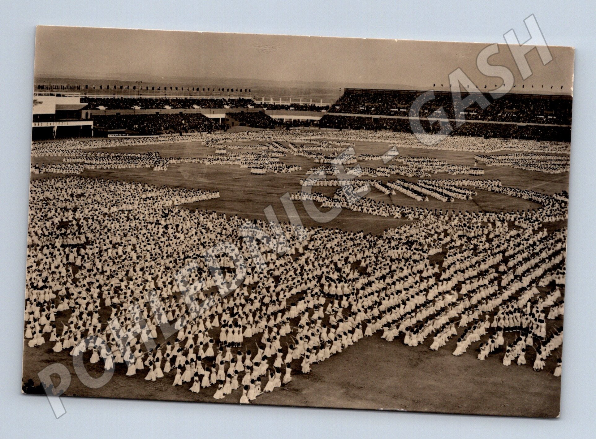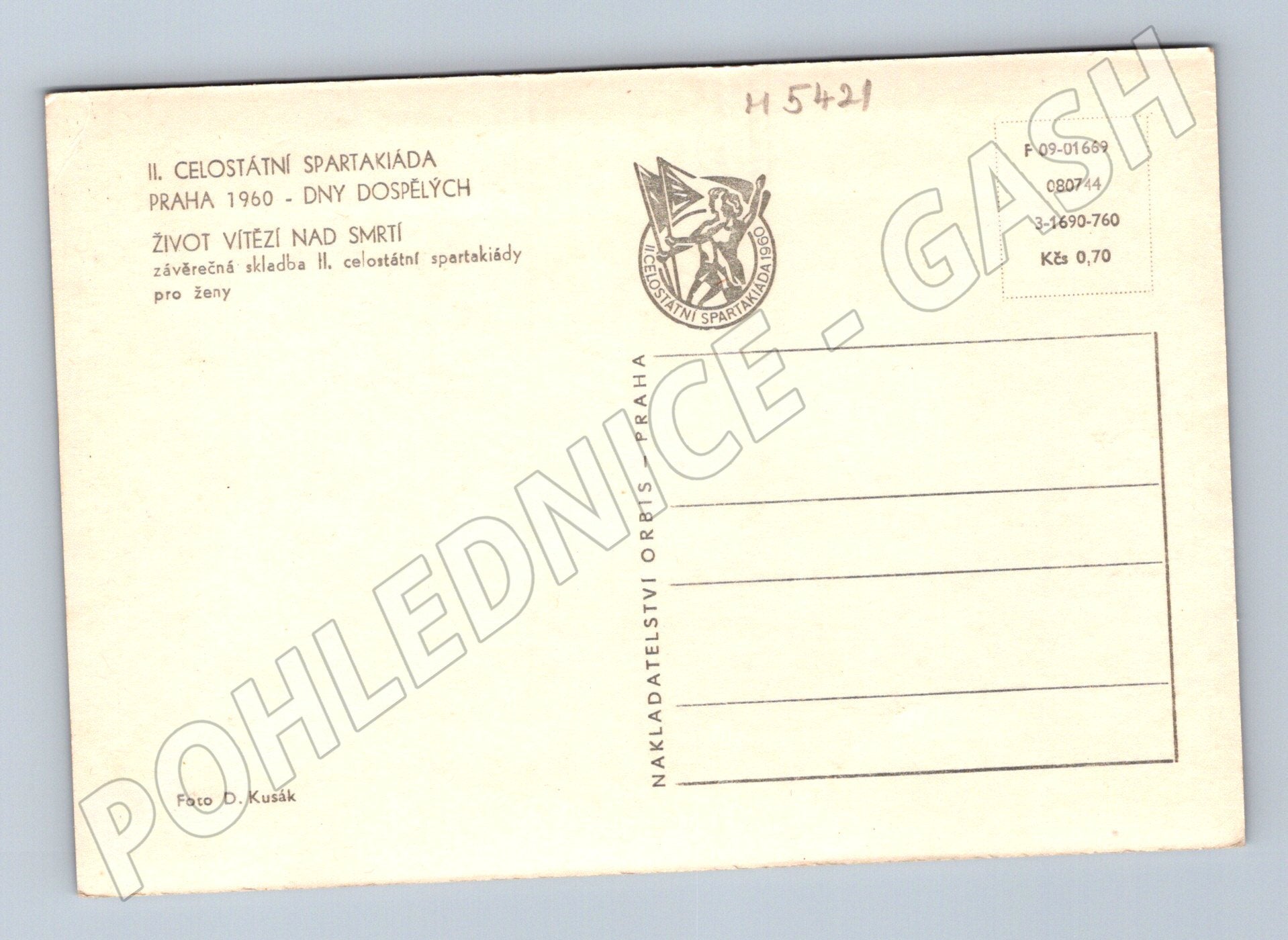 Originální historická pohlednice z II. celostátní spartakiády v Praze z roku 1960 zachycuje velkolepé vystoupení na stadionu během Dnů dospělých, konkrétně ženskou skladbu Život vítězí nad smrtí . Na pohlednici je vidět působivé množství cvičících účastnic v precizních formacích, v pozadí plné tribuny stadionu. Zadní strana je opatřena dobovým razítkem a popisem akce, vydal Orbis Praha, foto D. Kusák. Skvělý sběratelský kousek z období poválečného Československa, dokumentující masové sportovní akce a atmosféru tehdejší doby.
