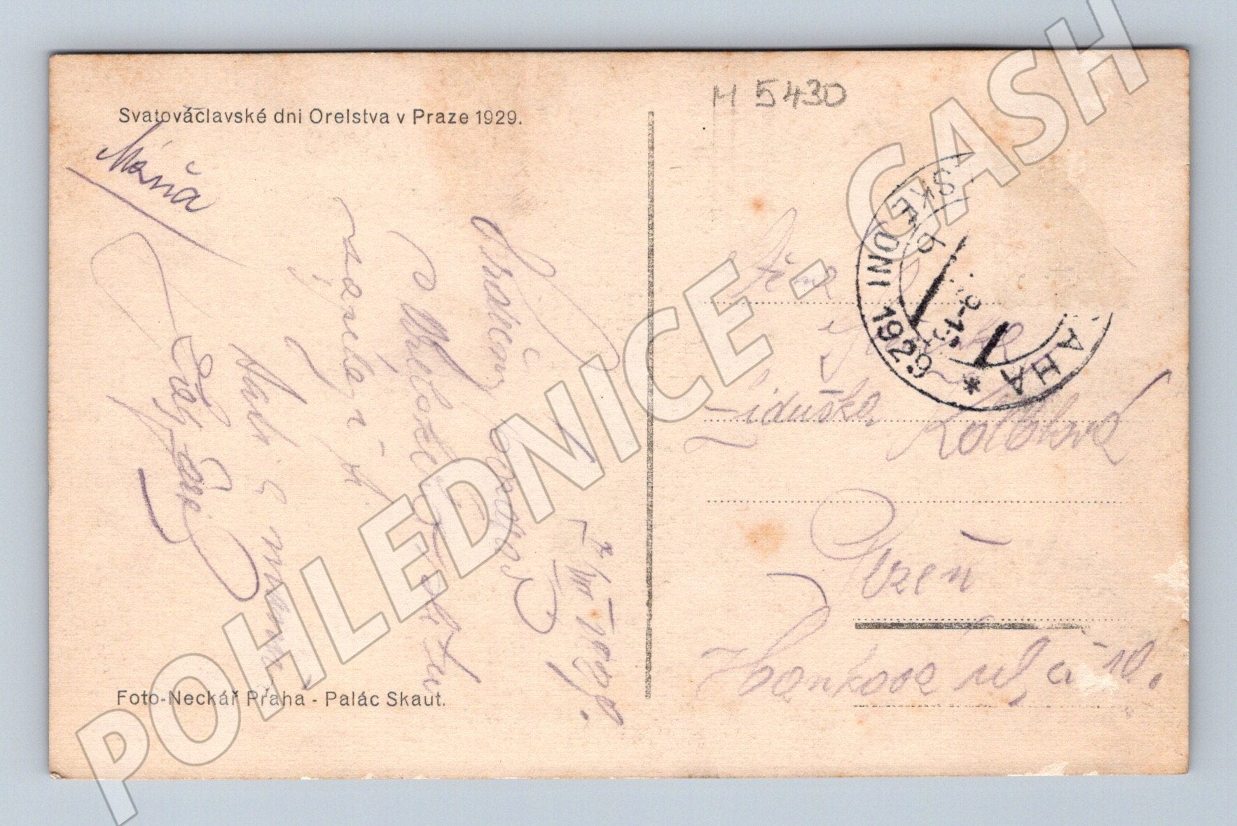 Originální černobílá pohlednice z roku 1929 dokumentuje slavnostní Svatováclavské dny Orelstva v Praze. Na přední straně je známý záběr na velký stadion plný cvičících členů Orelstva v typické choreografii. Pohlednice byla poslána poštou – na zadní straně najdete rukopisné věnování, známku i razítko z roku 1929. Velmi dobrý sběratelský stav, pouze drobné známky stáří a opotřebení dle fotek. Ideální přírůstek do sbírky prvorepublikových historických pohlednic Prahy a sportovních slavností.