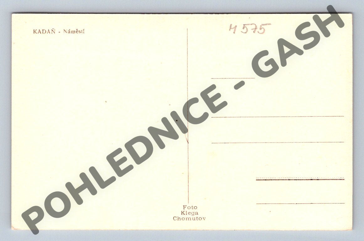Nabízím starou pohlednici zobrazující náměstí v Kadani. Pohlednice je černobílá a zachycuje charakteristickou věž a sochu na náměstí. Na zadní straně je tiskový údaj Foto Klega Chomutov a popisek KADAŇ - Náměstí. Pohlednice je v dobrém stavu, vhodná pro sběratele historických pohlednic ČR do roku 1950.