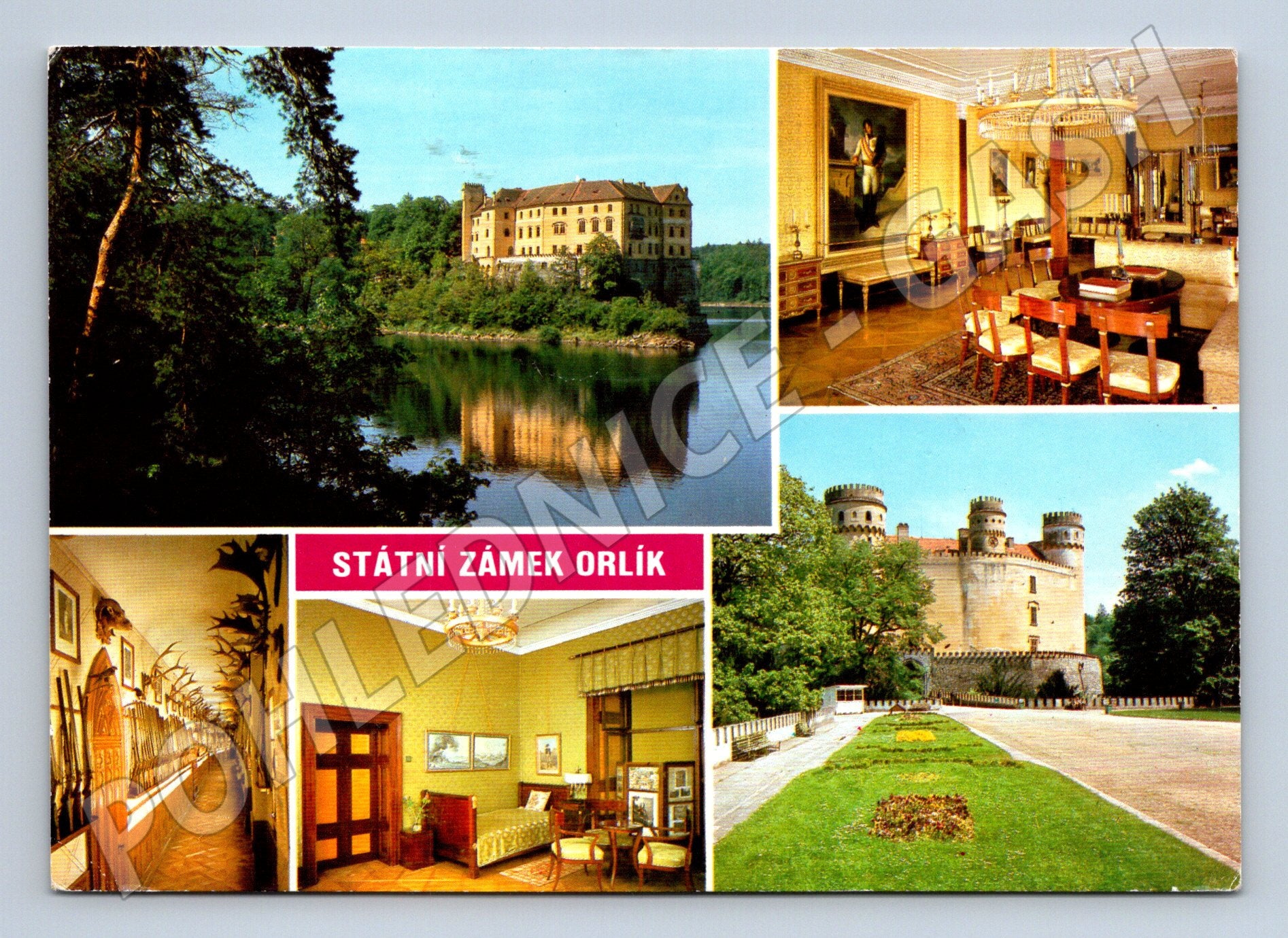 Originální pohlednice s motivem státního zámku Orlík nad Orlickou přehradou. Pohlednice zobrazuje nejen krásné exteriéry samotného zámku a jeho okolí včetně vodní plochy, ale také interiéry, například reprezentační sál či loveckou chodbu s trofejemi. Na zadní straně naleznete textový popis historie zámku – původně raně gotický hrad ze 13. století, později přestavěný a upravený. Pohlednice byla odeslána a je opatřena známkou ČSSR s motivem letadla, což ji činí zajímavou i pro sběratele podpisů a korespondence. Celkově velmi pěkný stav bez vážnějších vad. Ideální přírůstek do sbírky pohlednic s motivem českých zámků a hradů.