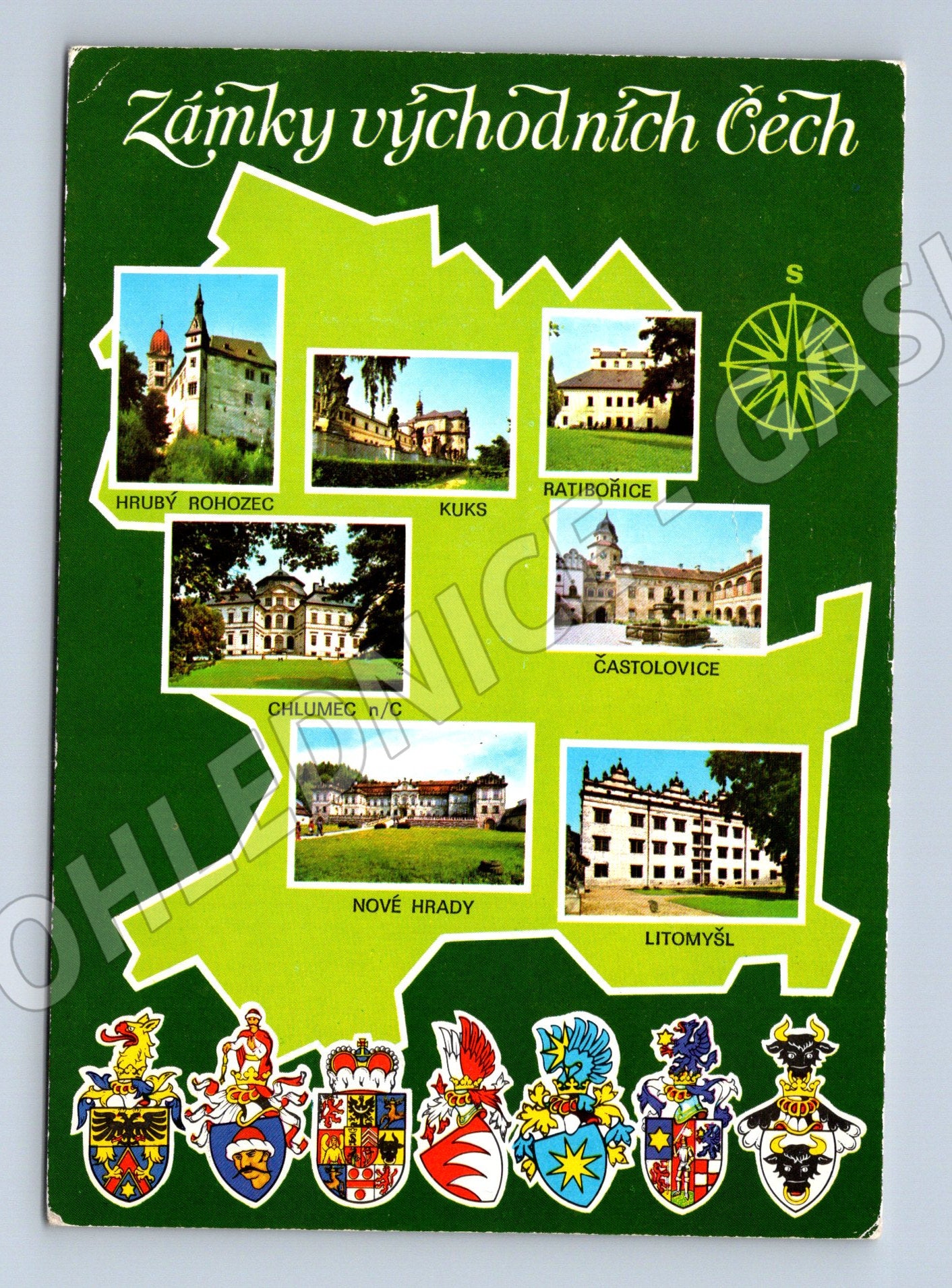 Pohlednice Zámky východních Čech zachycující několik významných zámeckých objektů této oblasti – Hrubý Rohozec, Kuks, Ratibořice, Karlova Koruna, Častolovice, Nové Hrady, Chlumec nad Cidlinou a Litomyšl. Na lícové straně pohlednice jsou barevné fotografie jednotlivých zámků zasazené do mapky regionu s regionálními erby. Zadní strana obsahuje rukopisný vzkaz a známku Československo s motivem lyžování a datem odeslání roku 1981. Výborný stav, mírné opotřebení rohů. Sběratelsky zajímavý kousek s krásným motivem historické architektury východních Čech.