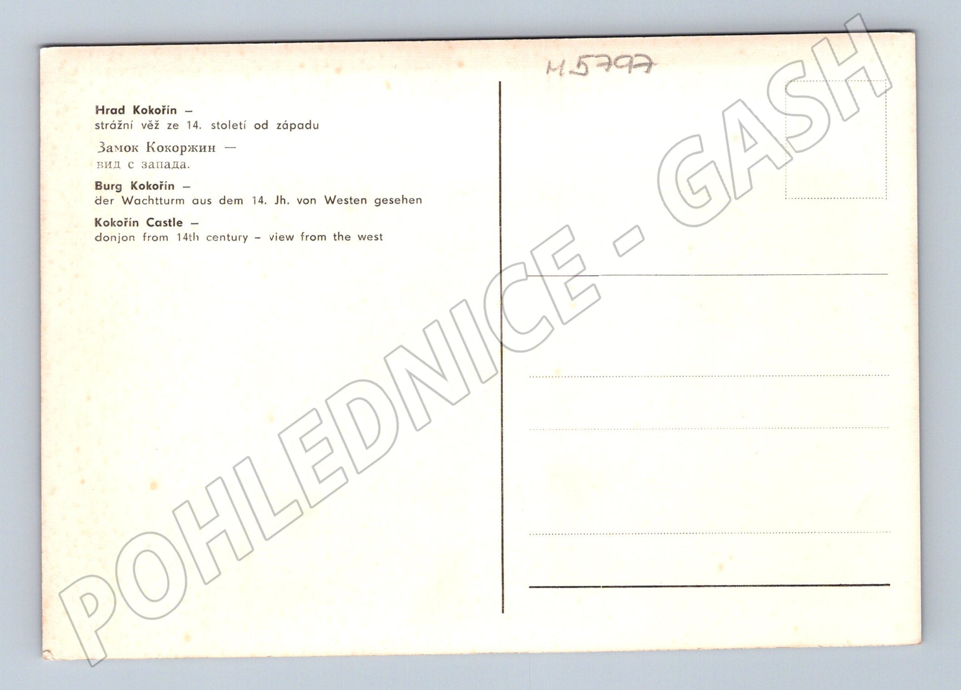 Originální pohlednice s motivem hradu Kokořín, zachycující strážní věž ze 14. století při pohledu od západu. Pohlednice je nepopsaná a ve velmi dobrém stavu bez známek poškození. Text na zadní straně popisuje historii hradu ve čtyřech jazycích (česky, rusky, německy, anglicky), což pohlednici dodává sběratelskou hodnotu i pro zájemce ze zahraničí. Vhodné pro sběratele historických památek, hrady, nebo jako stylový suvenýr do sbírky. Rozměr klasický, stáří odhadem 2. polovina 20. století.
