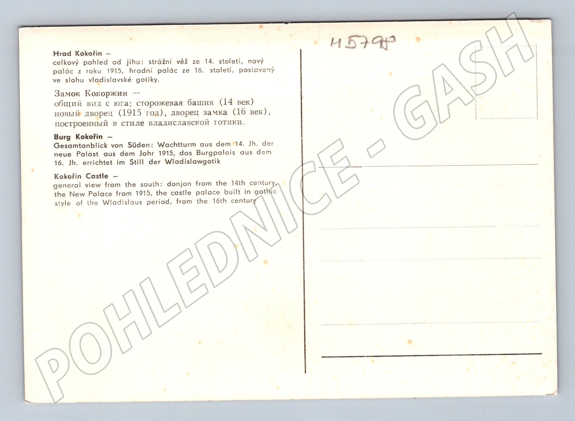 Nabízím originální pohlednici s motivem hradu Kokořín. Na přední straně je celkový pohled na hrad z jihu – dominantu tvoří strážní věž ze 14. století, nový palác z roku 1915 a hradní palác ze 16. století, které byly vybudovány ve stylu vladislavské gotiky. Pohlednice je nepoužitá, v zachovalém vintage stavu, s drobnými známkami stáří. Text na zadní straně je v češtině, ruštině, němčině a angličtině. Ideální pro sběratele i milovníky českých historických památek.