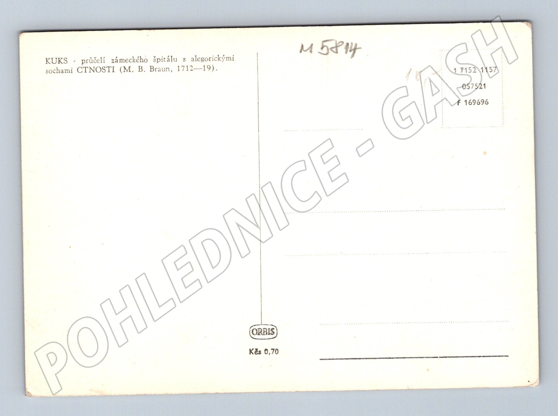 Originální černobílá pohlednice zachycující průčelí zámeckého špitálu v Kuksu s alegorickými sochami Ctností od Matyáše Bernarda Brauna (1712–1719). Pohlednice detailně zobrazuje slavný sochařský soubor a historickou budovu, která je významnou ukázkou barokní architektury v Česku. Text na zadní straně poskytuje informace o lokalitě i autorovi soch. Stav pohlednice odpovídá jejímu stáří, rohy mírně opotřebené, jinak pěkně zachovalá. Skvělý sběratelský kousek pro milovníky historie, architektury i regionálního dědictví.