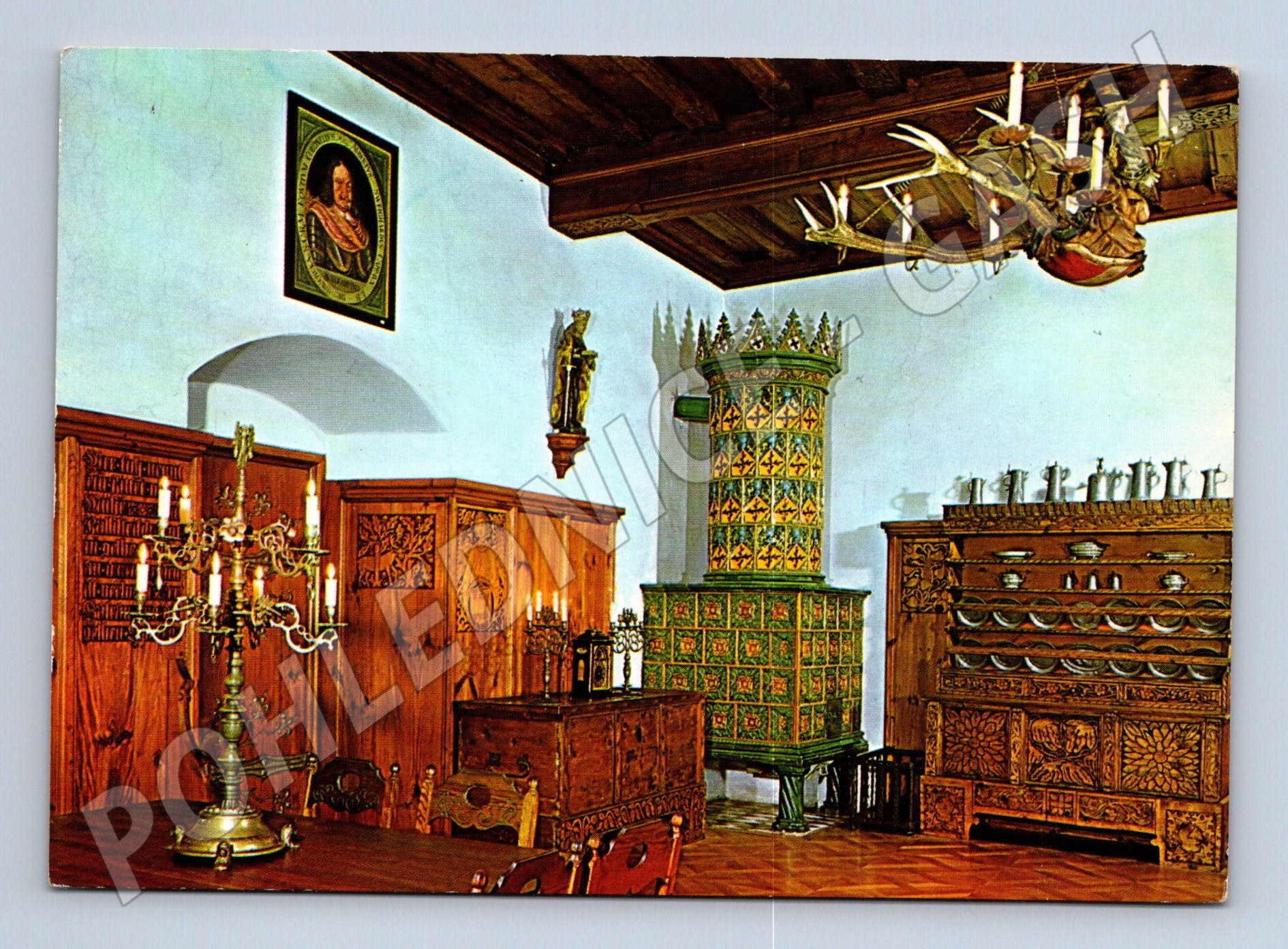 Pohlednice zachycuje interiér hradu Bouzov, konkrétně Velmistrovu jídelnu s renesančním příborníkem a cínovým nádobím. Místnost je bohatě zdobena historickým nábytkem, krásným zeleným kamnovým tělesem a svícny. Atmosféru doplňuje portrét na stěně a lustr ve tvaru draka. Na zadní straně pohlednice najdete popis v několika jazycích. Pohlednice je v dobrém stavu, vhodná pro sběratele i milovníky historie a architektury českých hradů.