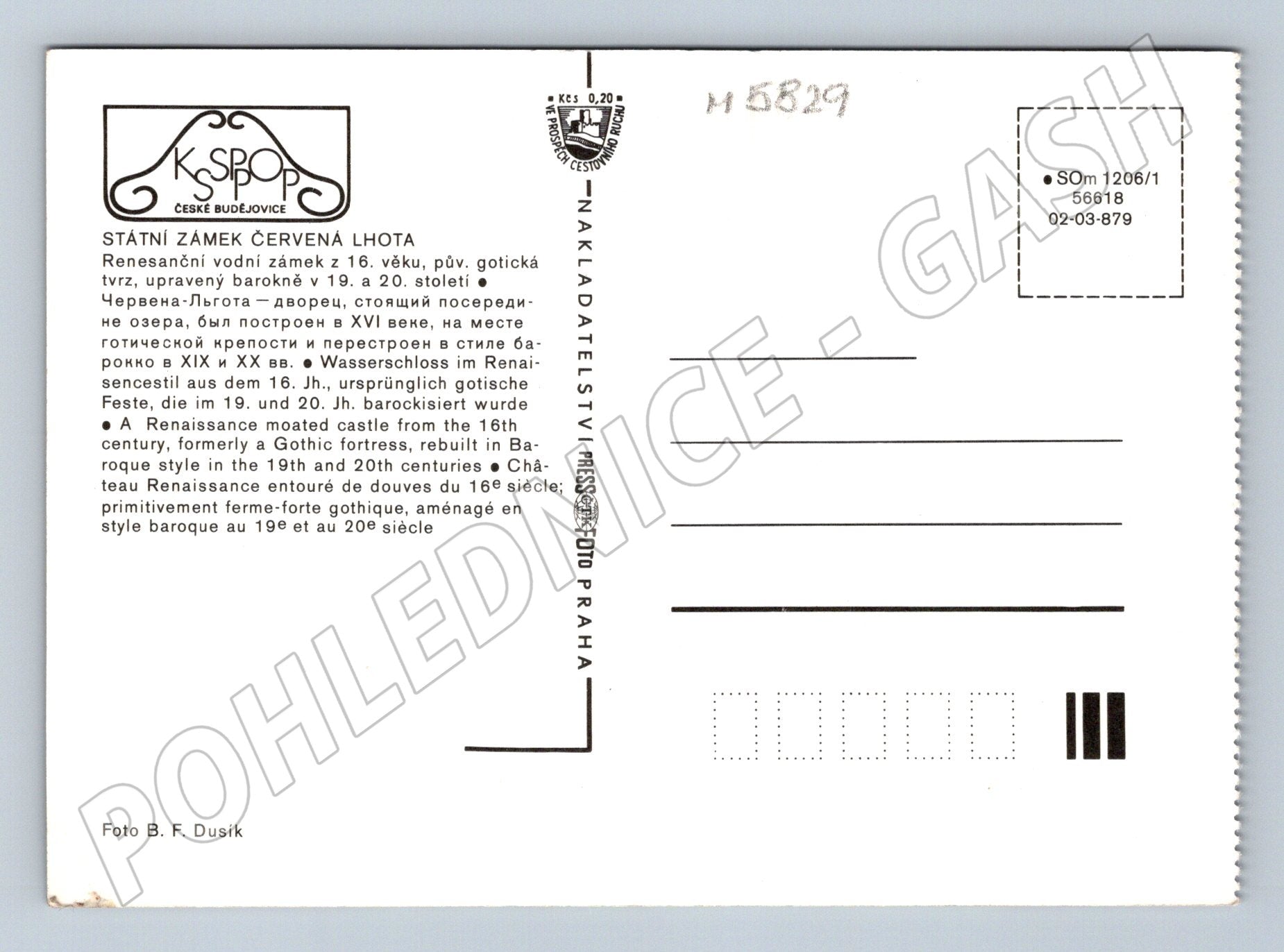 Originální pohlednice zachycující státní zámek Červená Lhota, unikátní renesanční vodní zámek z 16. století v jižních Čechách. Původně gotická tvrz, která byla v 19. a 20. století přestavěna v barokním stylu. Fotografii pořídil B. F. Dusík. Pohlednice je nepopsaná a ve velmi dobrém stavu, vhodná pro sběratele historických pohlednic i milovníky památek ČR. Na zadní straně popis objektu v pěti jazycích. Krásný pohled na zámek obklopený vodní hladinou a okolní přírodou.