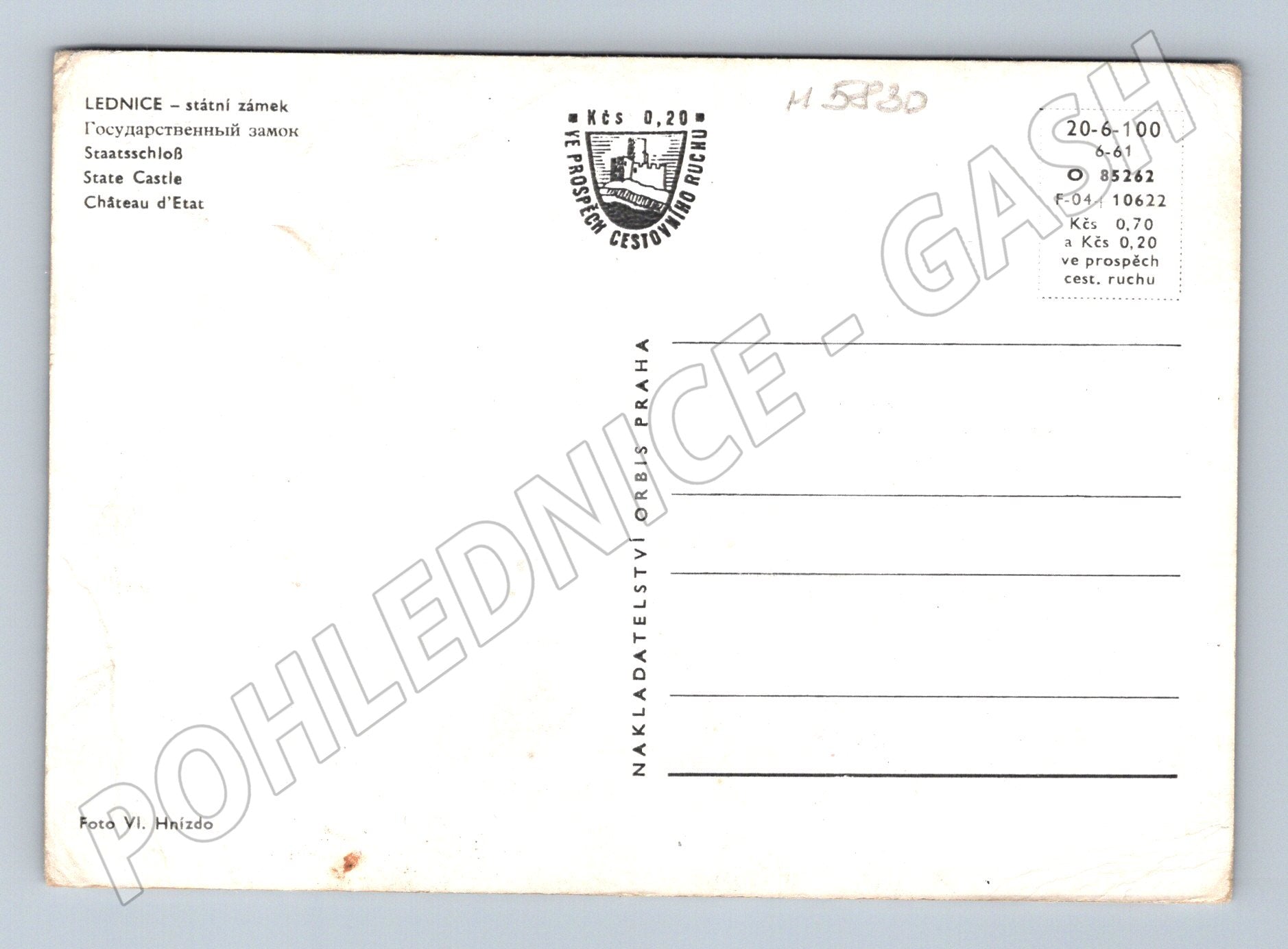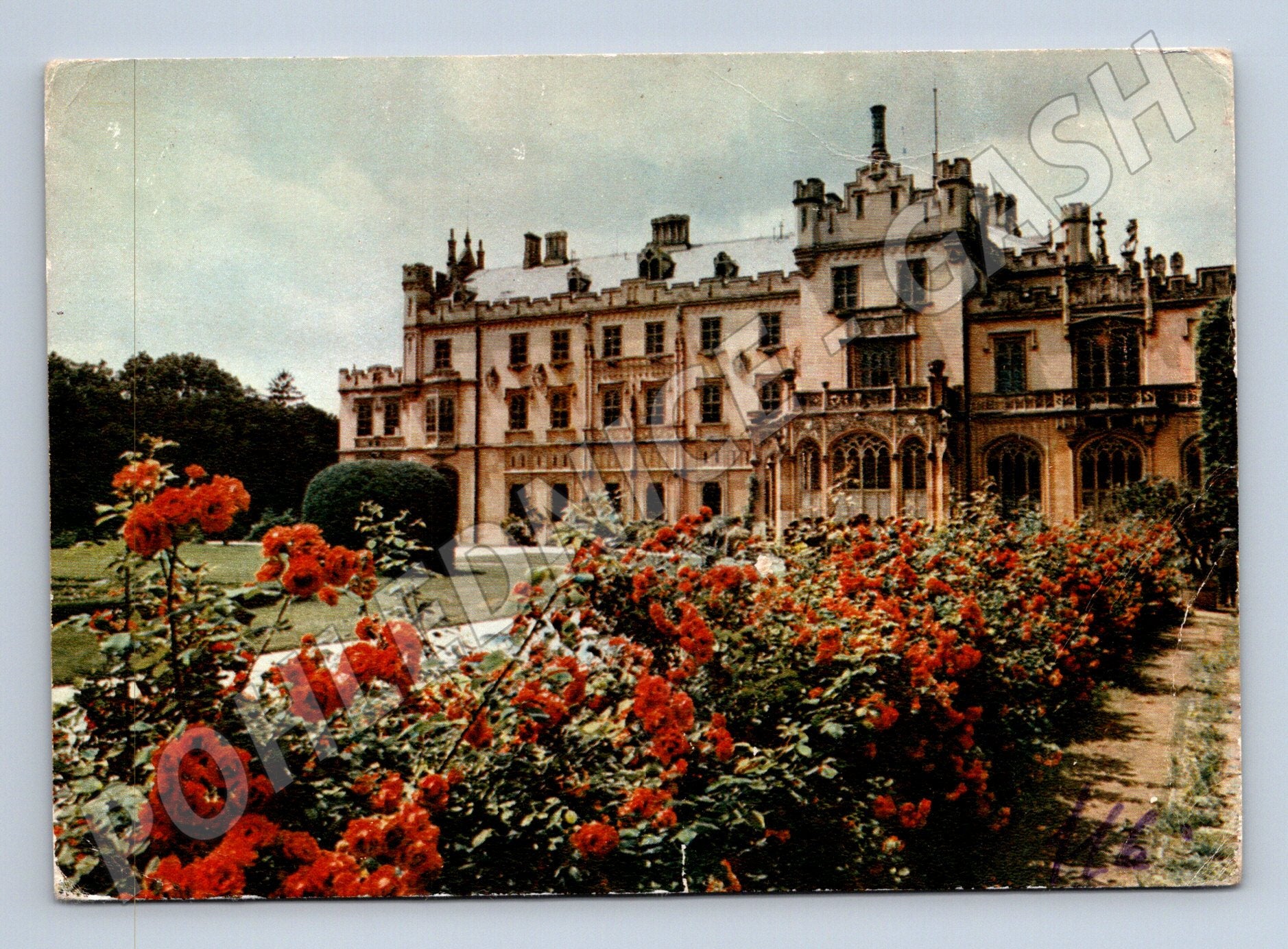 Pohlednice zachycuje impozantní státní zámek Lednice v obklopení rozkvetlých zahrad. Na přední straně je detailní barevná fotografie jednoho z nejvýznamnějších architektonických skvostů na Moravě v neogotickém stylu. Zadní strana pohlednice obsahuje vícejazyčný popis zámku a místo pro adresu a zprávu. Pohlednice byla vydána nakladatelstvím Orbis Praha, fotografii pořídil Vl. Hnízdo. Jedná se o sběratelsky zajímavý kus z období Československa, vhodný zejména pro milovníky historických památek a architektury. Stav viz foto, drobné opotřebení odpovídající stáří.
