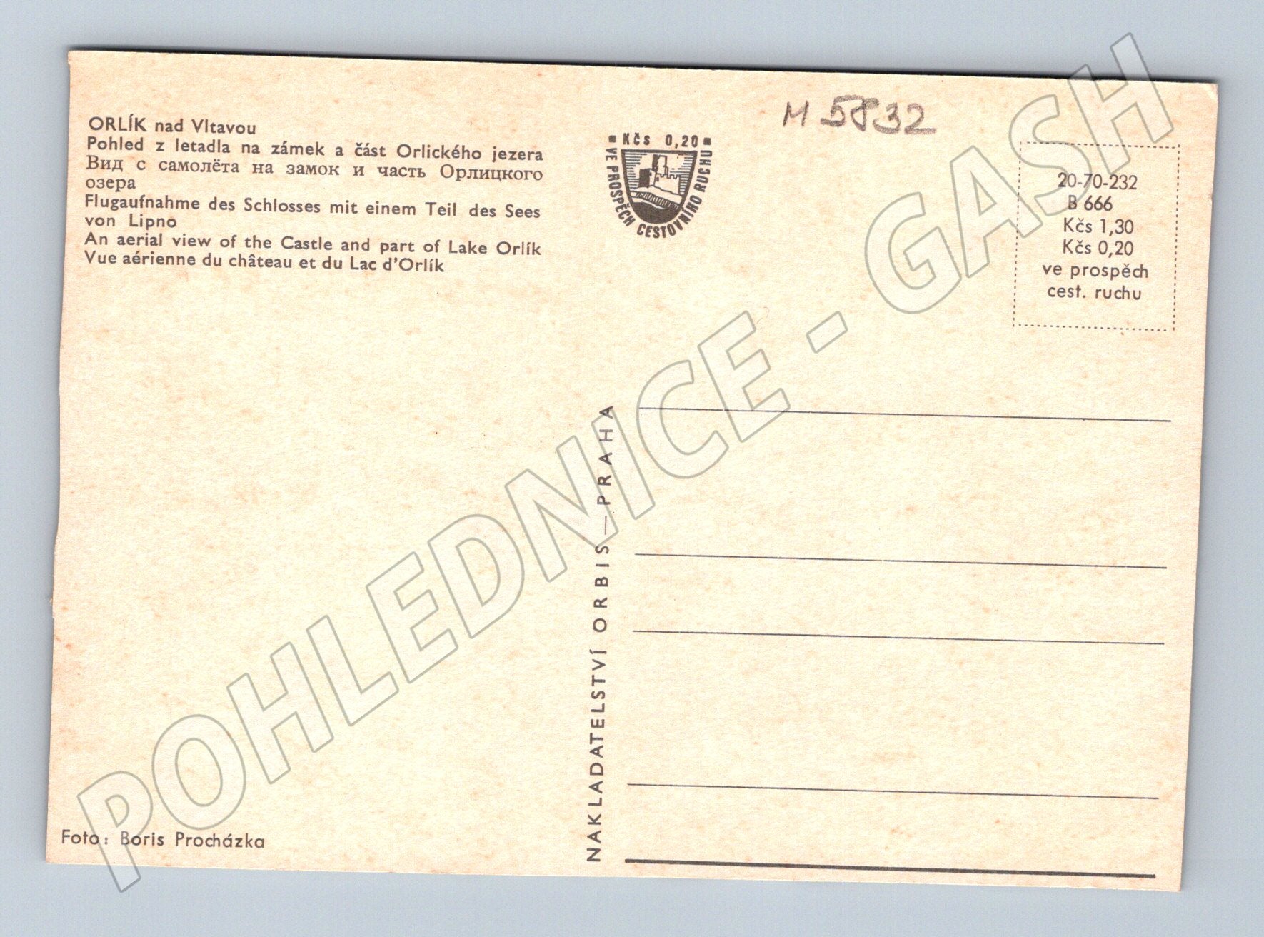 Originální pohlednice s barevným snímkem zámku Orlík nad Vltavou, zachyceného z vodní hladiny s částí Orlické přehrady a okolní přírodou. Na zadní straně naleznete vícejazyčný popis (česky, rusky, německy, anglicky, francouzsky) i informace o vydání – nakladatelství Orbis Praha, autorem fotografie je Boris Procházka. Pohlednice není popsána, ve velmi pěkném sbírkovém stavu. Jedná se o zajímavý sběratelský kousek pro milovníky historických památek a českých zámků.