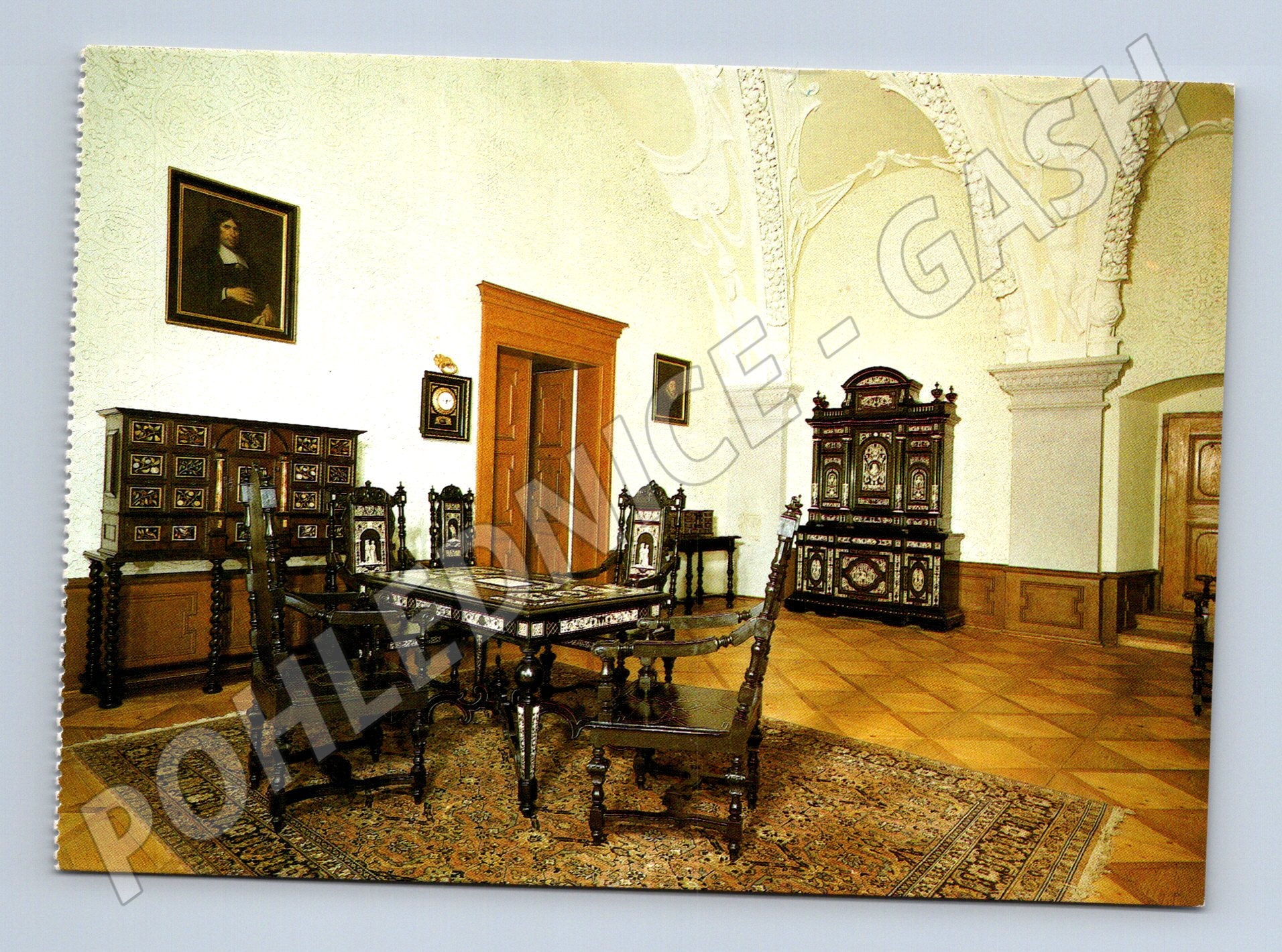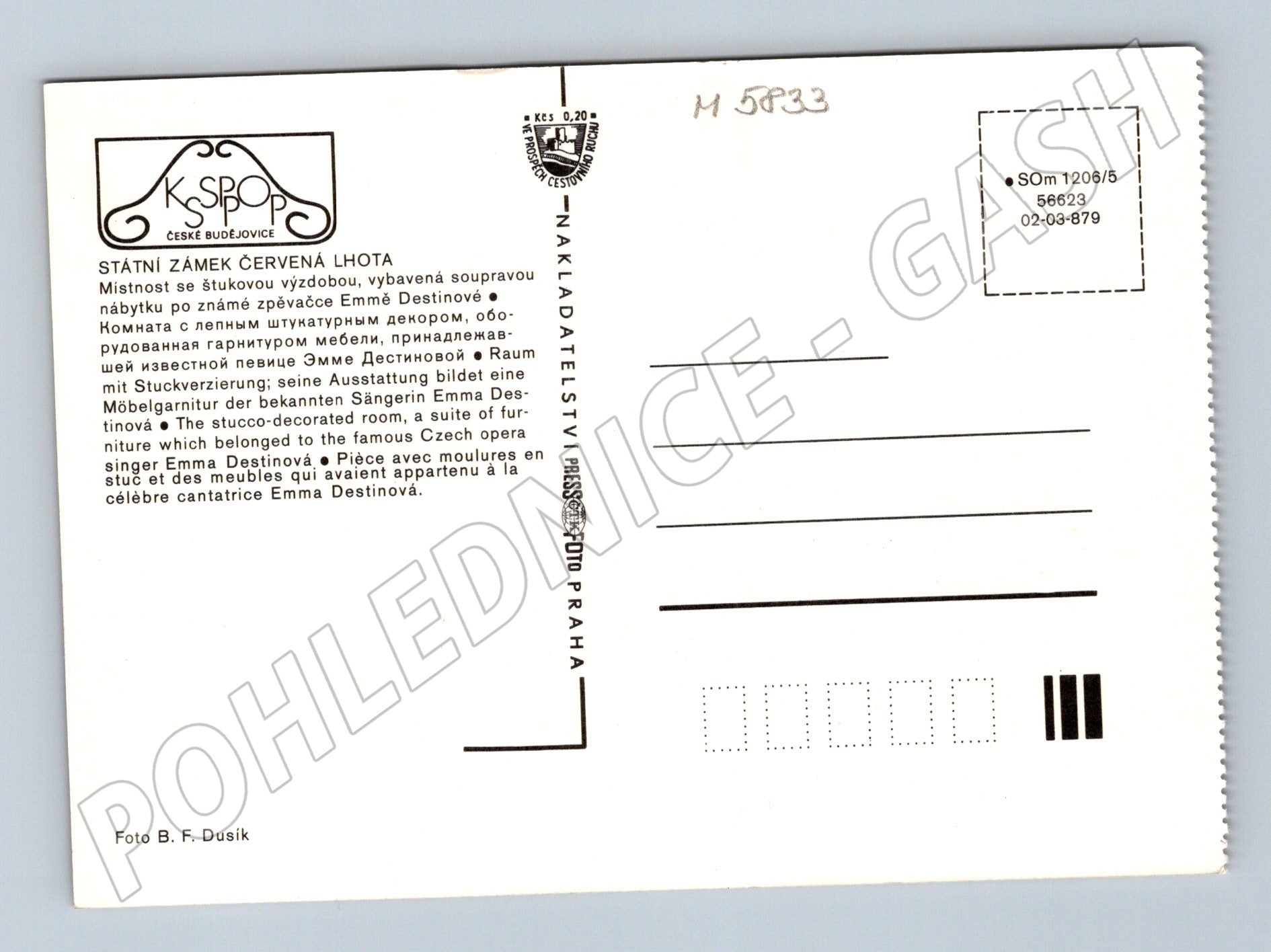 Originální pohlednice zobrazující interiér státního zámku Červená Lhota. Místnost je vyzdobena bohatou štukovou výzdobou a stylovým nábytkem, který patřil slavné české operní pěvkyni Emmě Destinnové. Na pohlednici je detailně zachyceno historické zařízení místnosti, včetně obrazů, gobelínů a luxusního dřevěného nábytku. Popis v několika jazycích na rubu pohlednice. Ideální pro sběratele pohlednic, milovníky historie a architektury nebo jako jedinečný dárek. Pohlednice je v pěkném stavu, bez zápisu, viz sken.