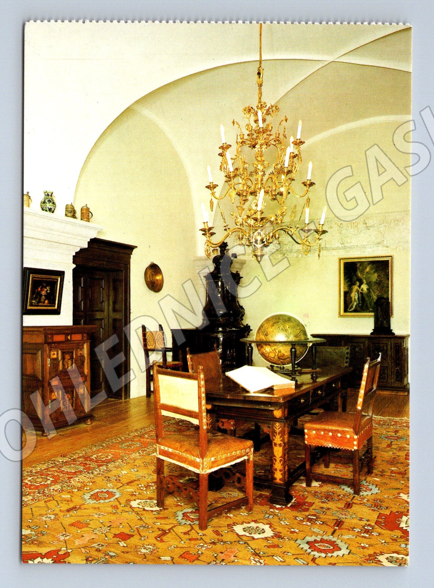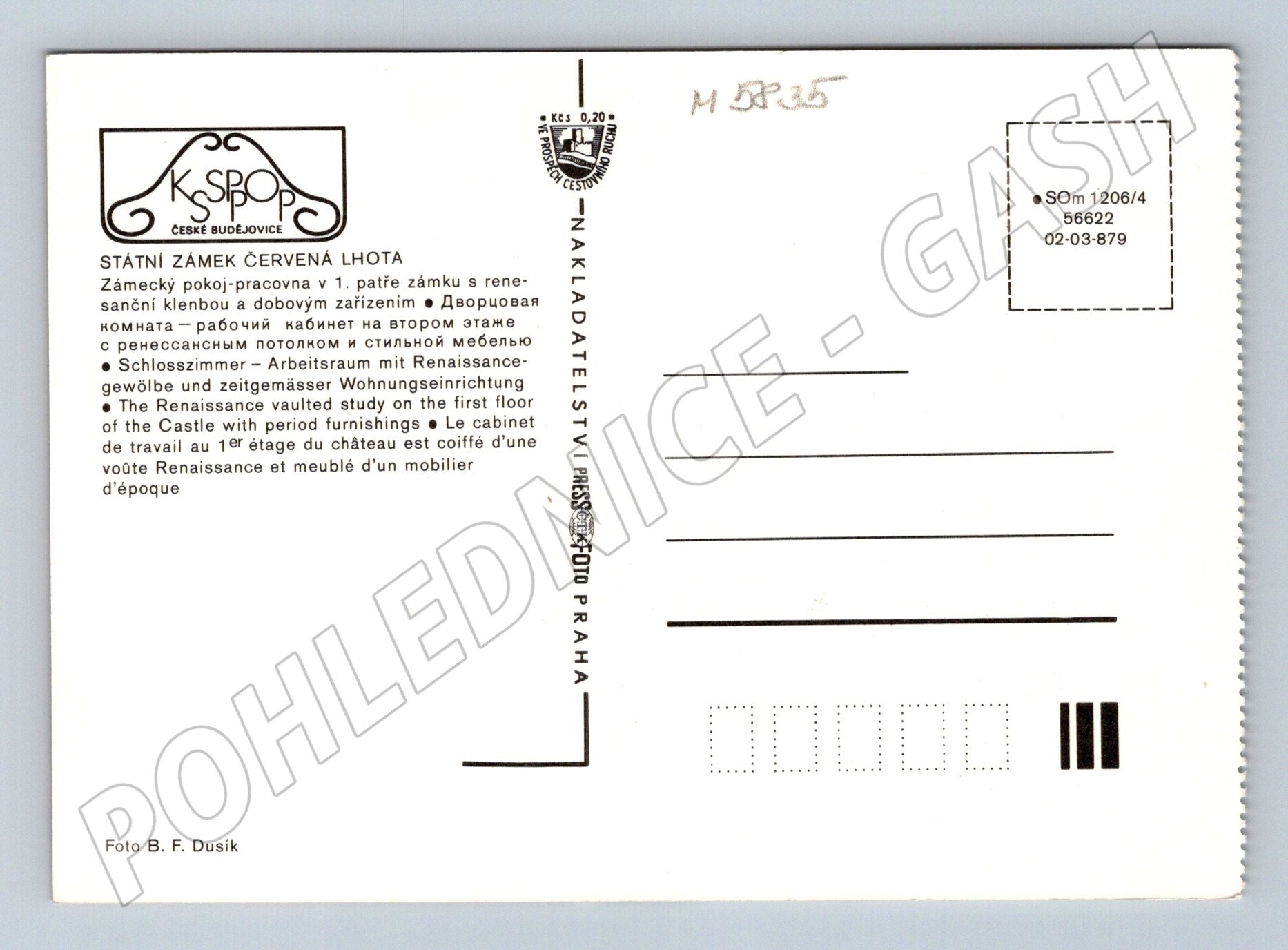 Pohlednice zachycuje interiér státního zámku Červená Lhota, konkrétně zámecký pokoj – pracovnu v 1. patře zámku s renesanční klenbou a dobovým zařízením. Stylová výzdoba zahrnuje krásný renesanční nábytek, bohatě zdobený lustr a další historické prvky. Na zadní straně pohlednice je popis místnosti v několika jazycích. Jedná se o sběratelsky zajímavý pohled do interiéru jednoho z nejznámějších českých zámků, vhodné pro milovníky památek a historických pohlednic. Fotografie: B. F. Dusík. Stav viz foto.