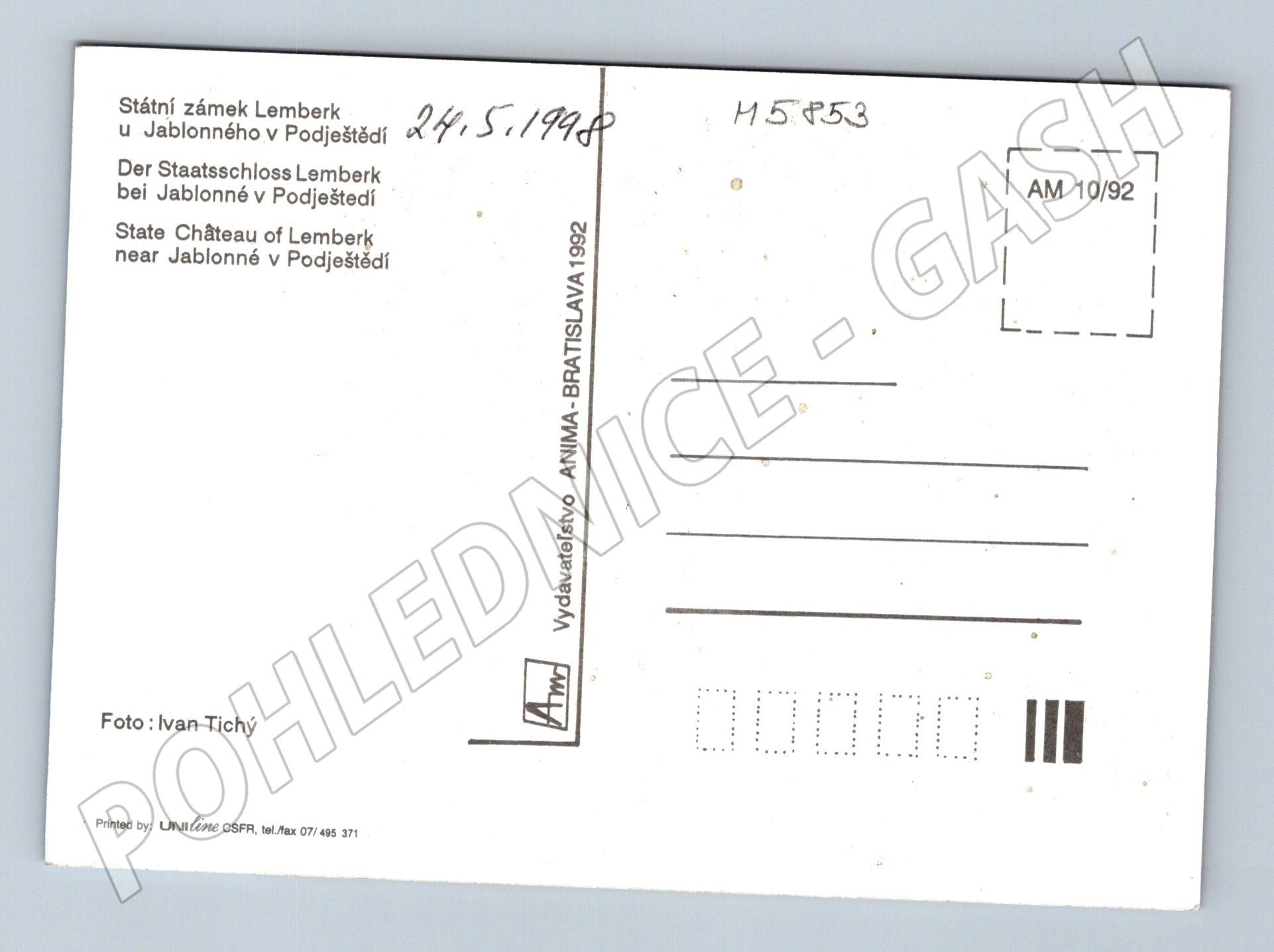 Pohlednice zachycuje státní zámek Lemberk u Jablonného v Podještědí, jak jej lze spatřit z pohledu přes okolní lesy. Na zadní straně je popis v několika jazycích (česky, německy, anglicky), pohlednice byla vydána v roce 1992 vydavatelstvím ANIMA Bratislava. Fotografie je dílem Ivana Tichého. Pohlednice je čistá, nepopsaná, pouze s drobným rukopisným datem z předchozí sbírky. Velmi pěkný sběratelský stav.