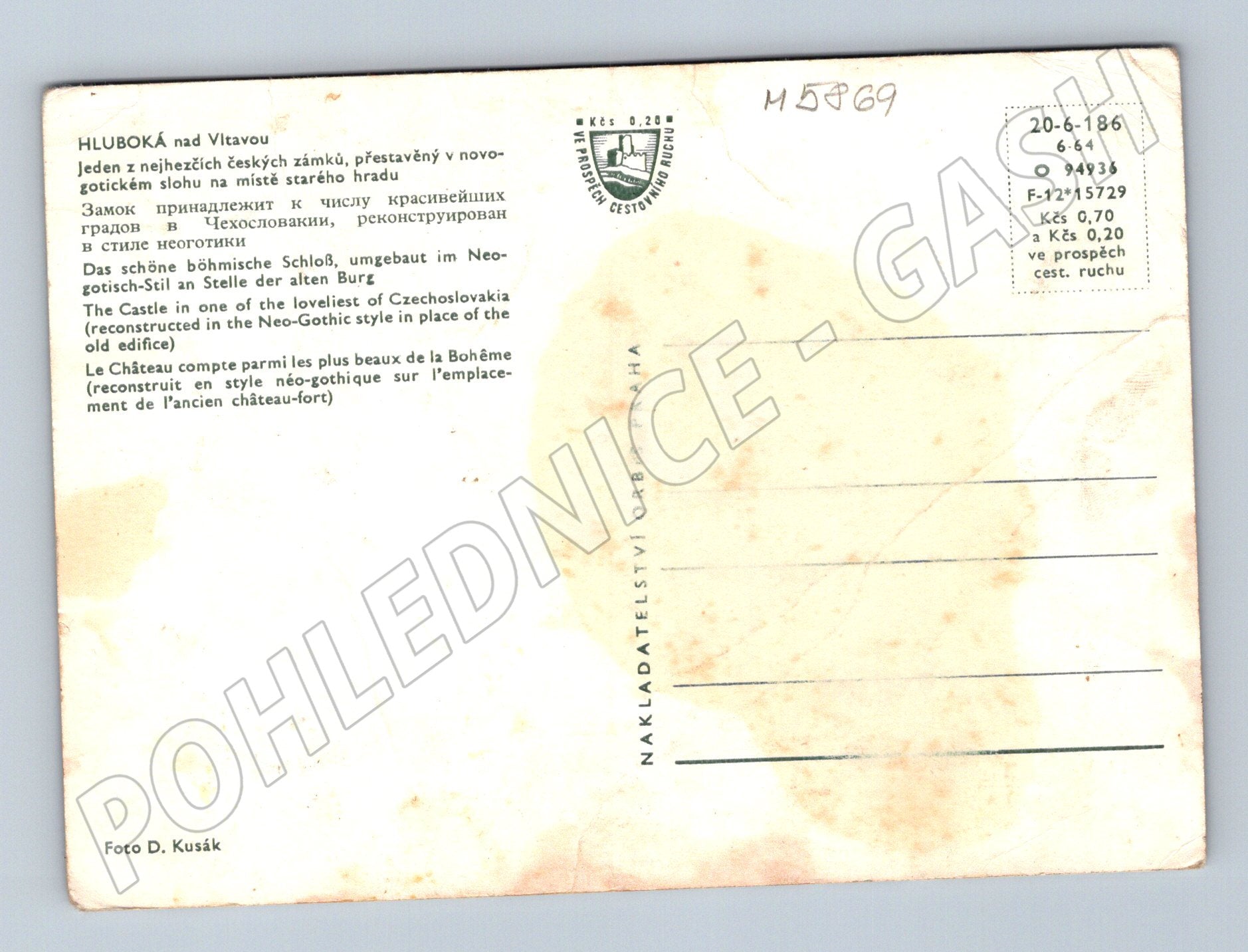Originální pohlednice se zámkem Hluboká nad Vltavou, jedním z nejkrásnějších českých zámků, přestavěným do novogotického stylu. Na fotografii je zachycen pohled na část zámeckého parku s upravenými květinovými záhony. Na zadní straně najdete stručný popis v několika jazycích a prostor pro adresu a zprávu. Pohlednice nese známky stáří a používání – viditelné jsou mírné ohyby a oděrky na hranách a rozích. Skvělá volba pro sběratele, milovníky Českých památek, nebo jako dekorace. Vydalo nakladatelství Orbis Praha, foto D. Kusák.